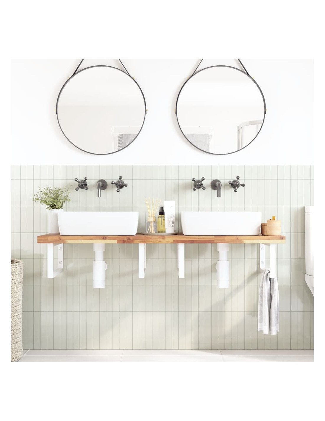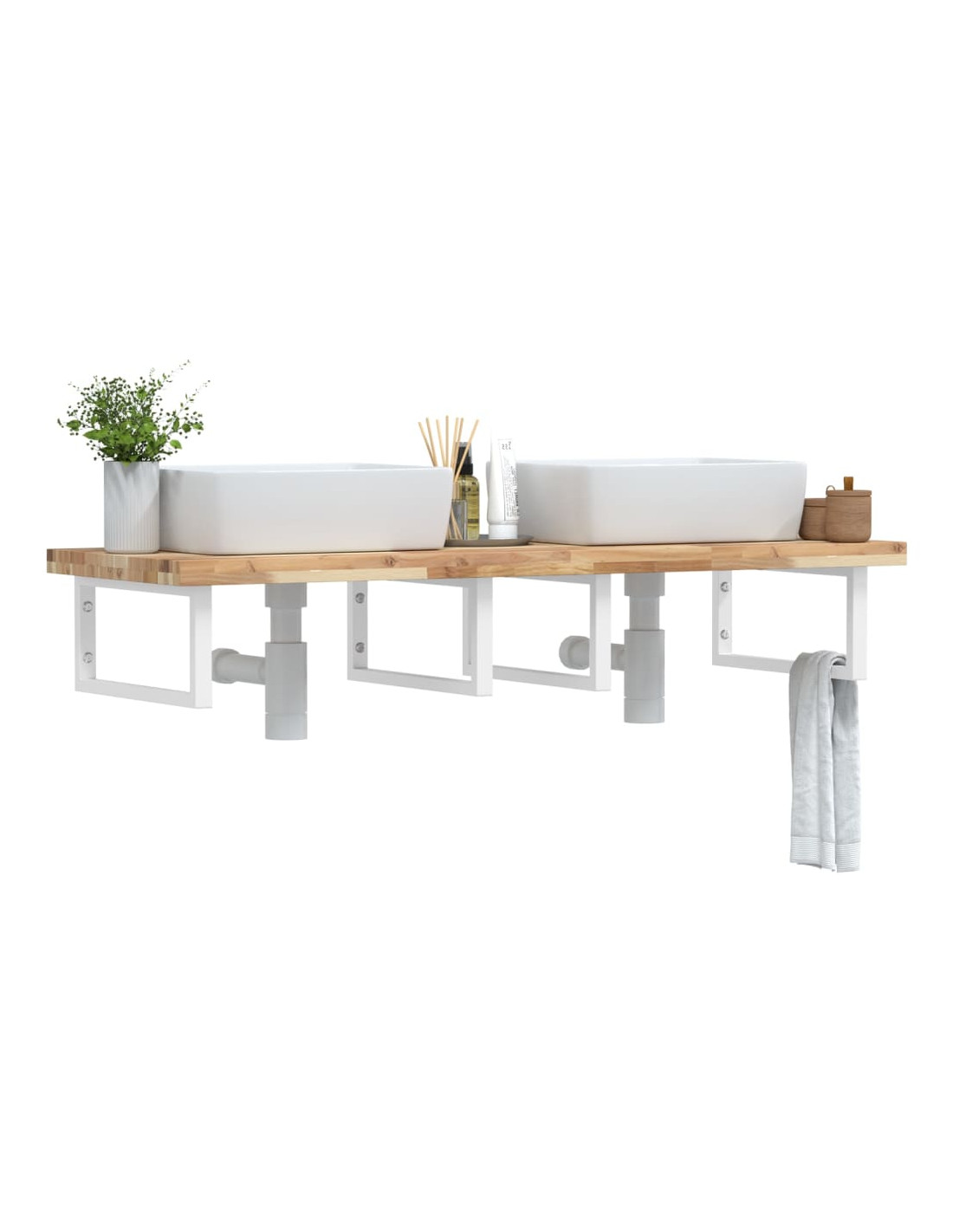 Il ripiano per lavabo a parete si fissa saldamente alla parete, offrendo una soluzione elegante e salvaspazio per il vostro bagno. Robusto e duraturo: Questo ripiano per lavabo è abbinato con una struttura in acciaio e un piano in legno massello di acacia, che lo rendono robusto, stabile e duraturo.Salvaspazio: il ripiano lavabo sospeso ha ampio spazio per riporre creme e piccoli oggetti. Grazie alla forma rettangolare, potete appendere asciugamani o altro sul supporto per risparmiare spazio.Facile da usare: il piano di lavoro non è forato per consentire il montaggio del lavabo a sinistra, a destra o al centro, a seconda delle esigenze della stanza. Grazie ai fori predisposti nel supporto, può essere facilmente assemblato con il piano e montato a parete.Ampie applicazioni: grazie al suo design moderno, offre spazio aggiuntivo per vari tipi di bagni. Buono a sapersi:Le viti non sono incluse, è possibile acquistarle separatamente in base alle informazioni fornite di seguito.Fissaggio a parete: 2 viti di espansione M8 per staffaPiano in legno: 2 viti M5x18 (T=2) o 2 viti M5x20 (T=2,5/4cm) per staffa