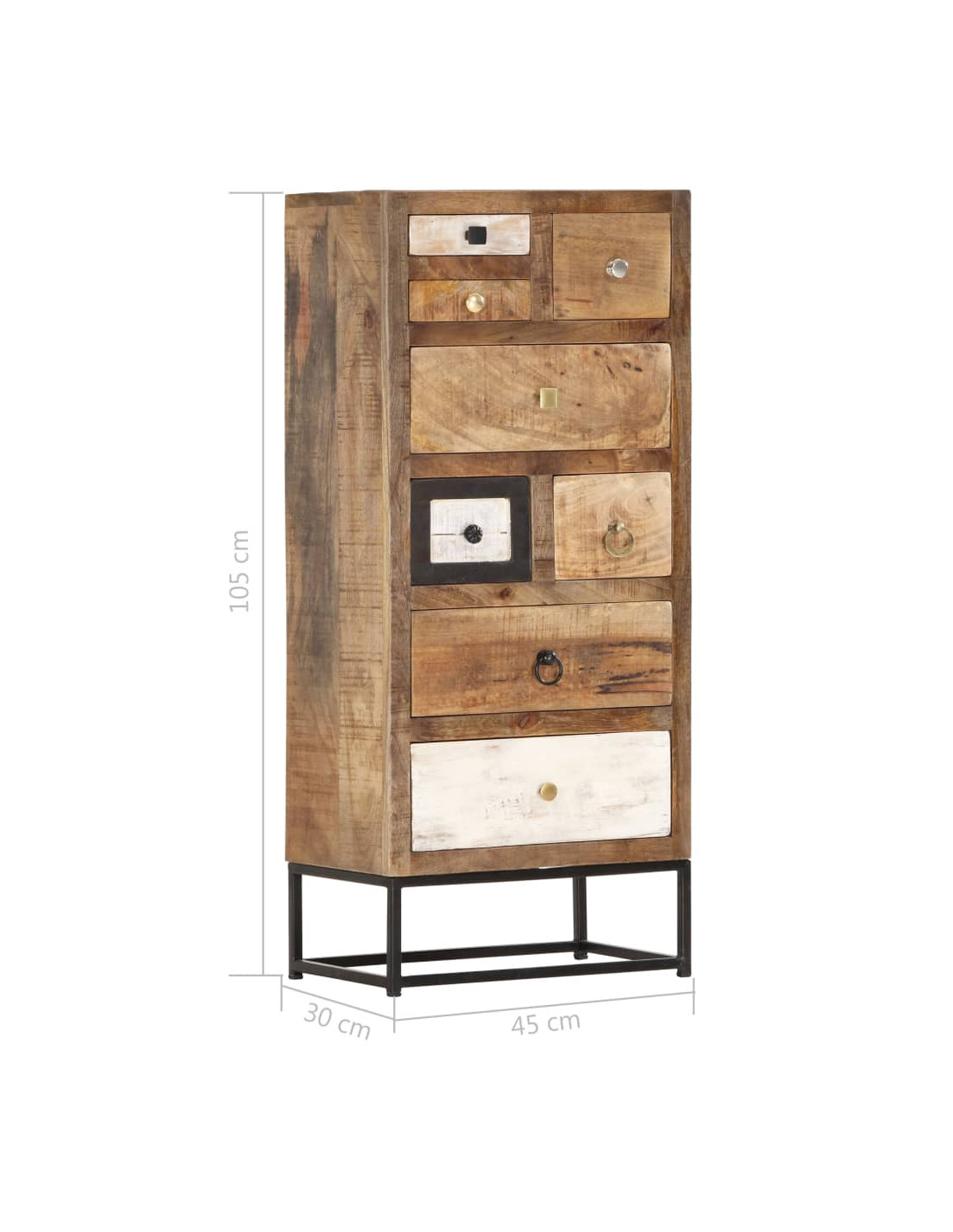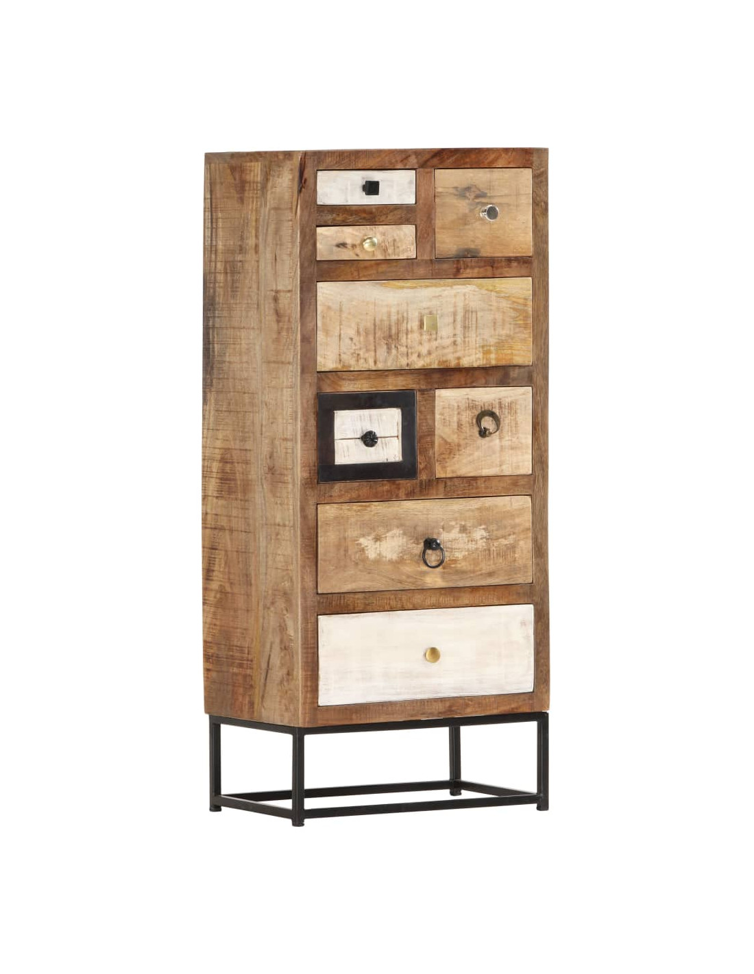 La cassettiera è realizzata in legno massello di recupero proveniente da travetti, pavimentazioni e travi di sostegno di vecchi edifici demoliti ed è costituita da diversi tipi di legno come il pino, il teak, il faggio, la quercia, il cedro, il mango, l'acacia, etc. Il legno di recupero conserva le caratteristiche dei legni originali di cui è composto ed è già invecchiato, stagionato ed essiccato, per cui non si restringe o si deforma. Le eleganti venature del legno rendono ogni pezzo unico e leggermente diverso da tutti gli altri. Le gambe in acciaio verniciato a polvere sottolineano lo stile industriale del prodotto. Il mobile dispone di 8 cassetti che offrono ampio spazio per riporre vestiti, libri e oggetti vari.
