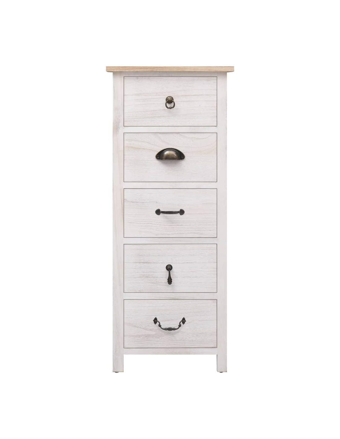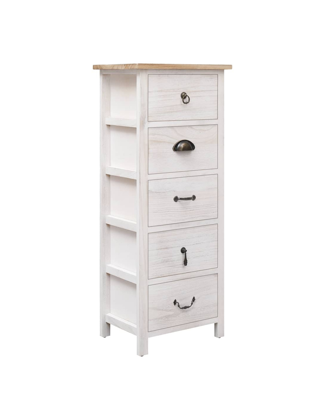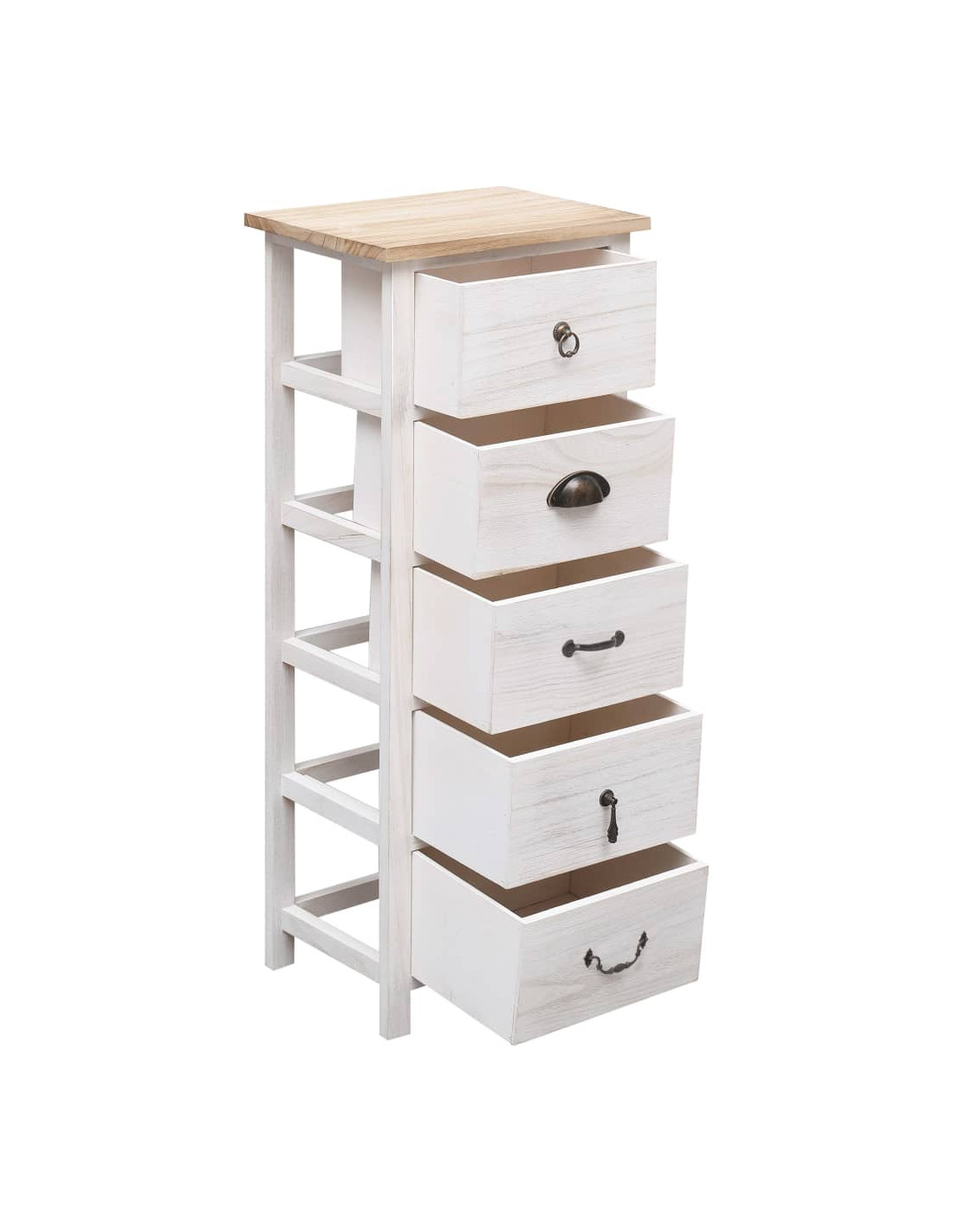 Realizzata in legno massello di paulownia, questa cassettiera è estremamente resistente e robusta. La credenza offre un ampio spazio di conservazione con 5 cassetti. Inoltre, il robusto piano del tavolo è ideale per esporre oggetti decorativi, cornici per foto o piante in vaso. È facile da pulire con un panno umido. La credenza è facile da assemblare