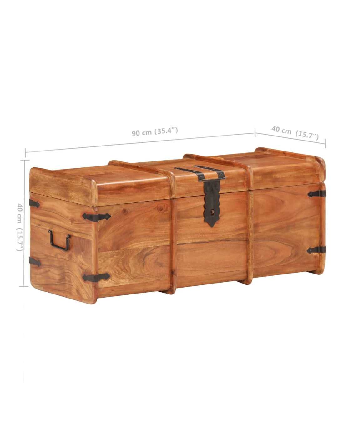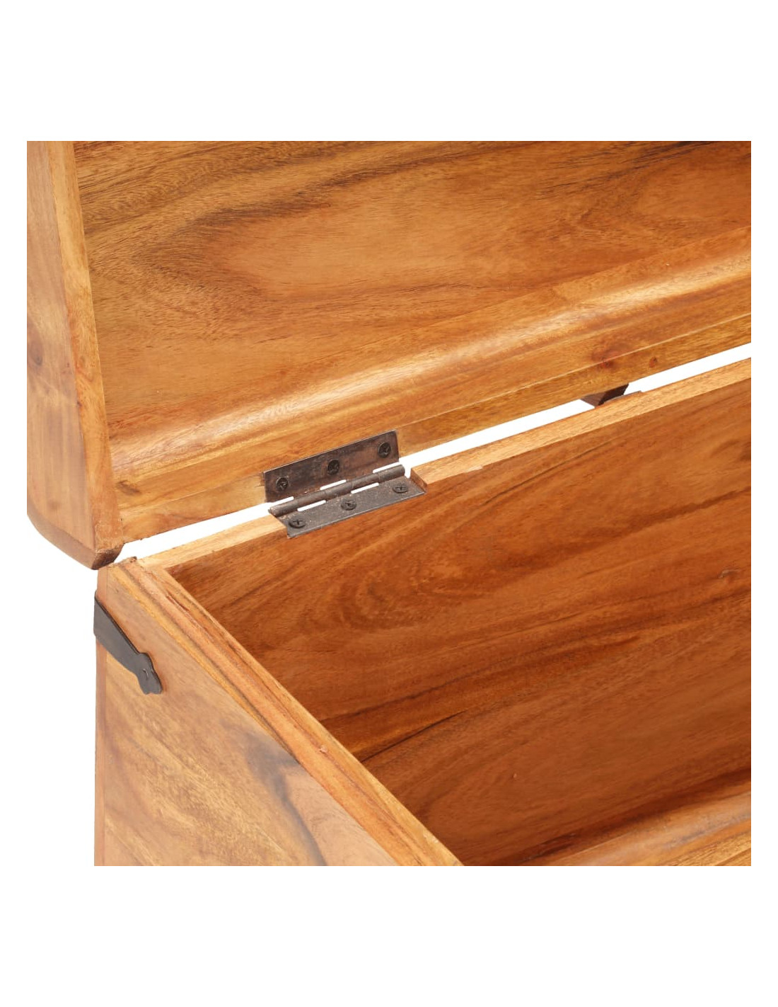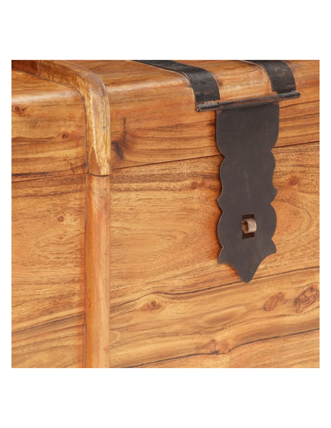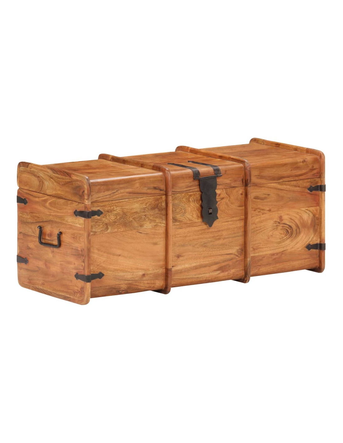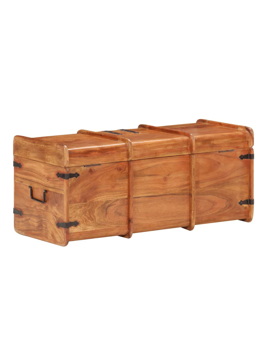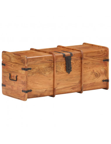 Questo baule è realizzato in legno massello di acacia, che rende il prodotto robusto e resistente. Presenta un gancio sul davanti e due maniglie laterali per facilitarne il sollevamento. Questa cassa portaoggetti, con una superficie superiore piana e robusta, può essere utilizzata anche per mettere in mostra le vostre cose. La lavorazione artigianale e le belle venature del legno rendono ogni mobile unico e leggermente diverso da tutti gli altri.