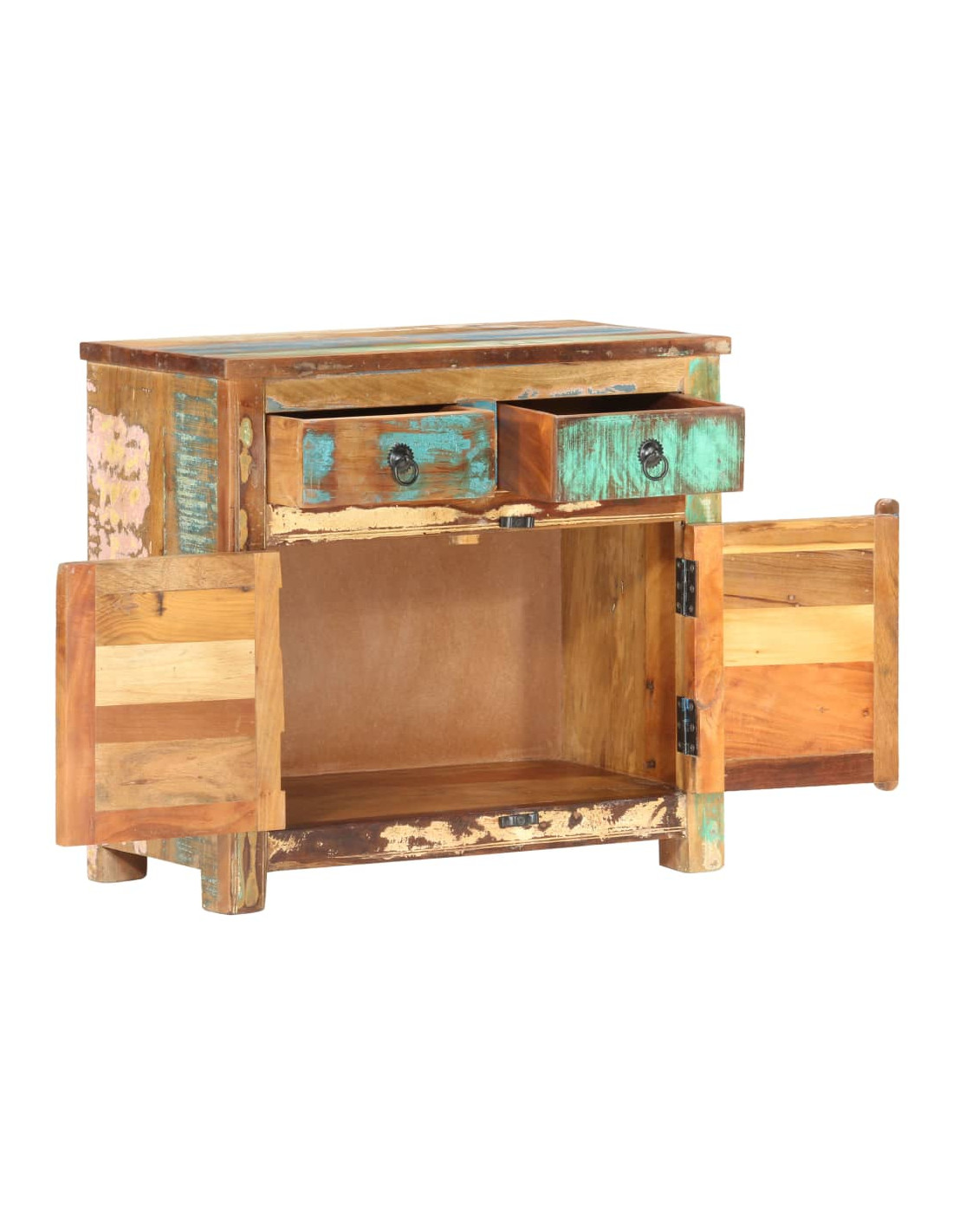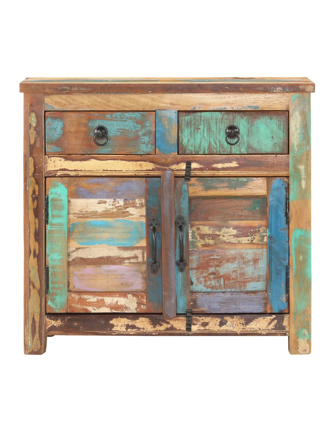 Questa credenza è realizzata in legno massello di recupero, ciò significa che ogni pezzo è unico e diverso dall'altro. I mobili in legno di recupero hanno le caratteristiche di legni diversi come il teak, il legno di mango e l'acacia. Il legno recuperato è solido, stabile, durevole e bello. Segni di usura e struttura a grana visibile conferiscono a ogni pezzo una propria storia e un aspetto unico.