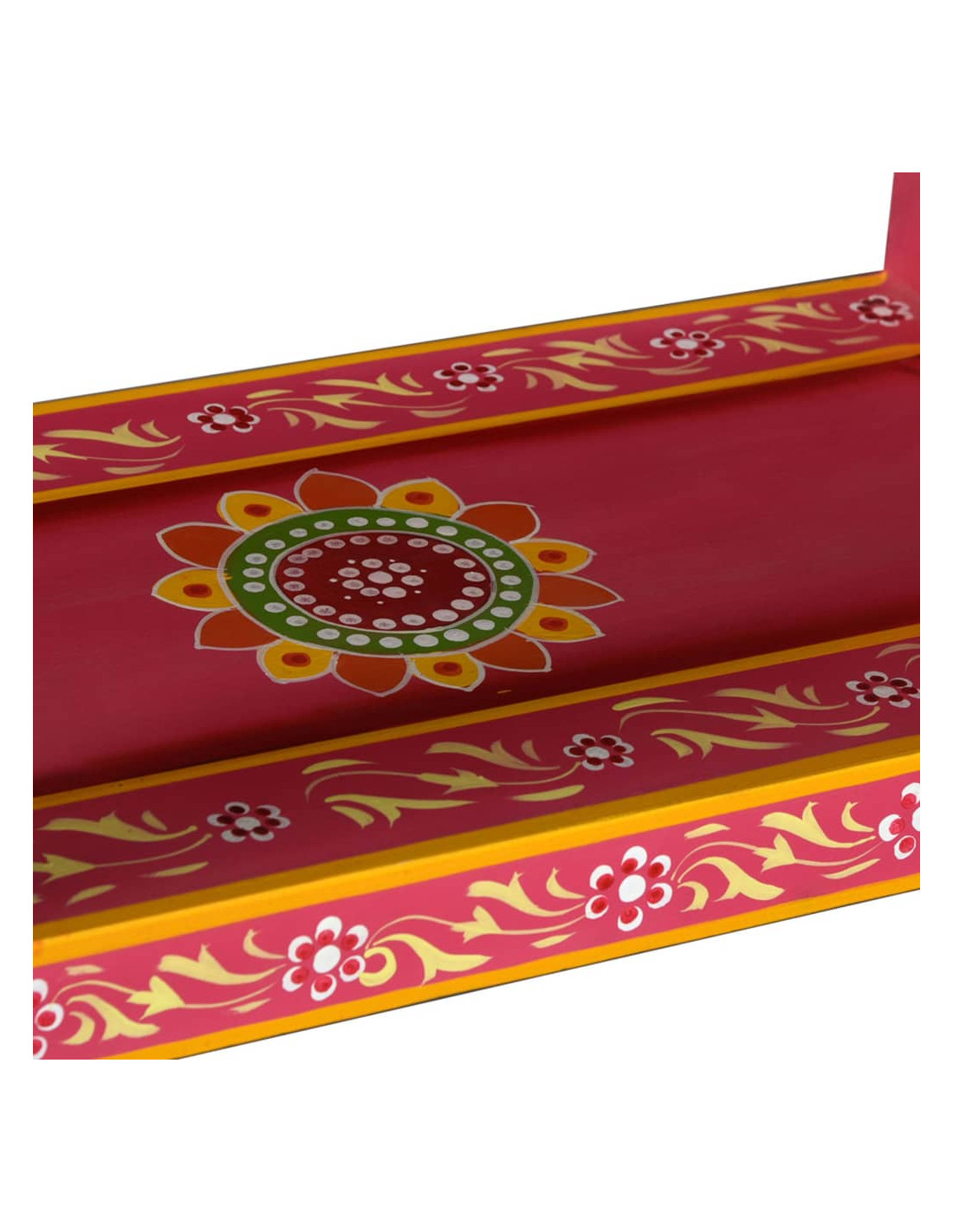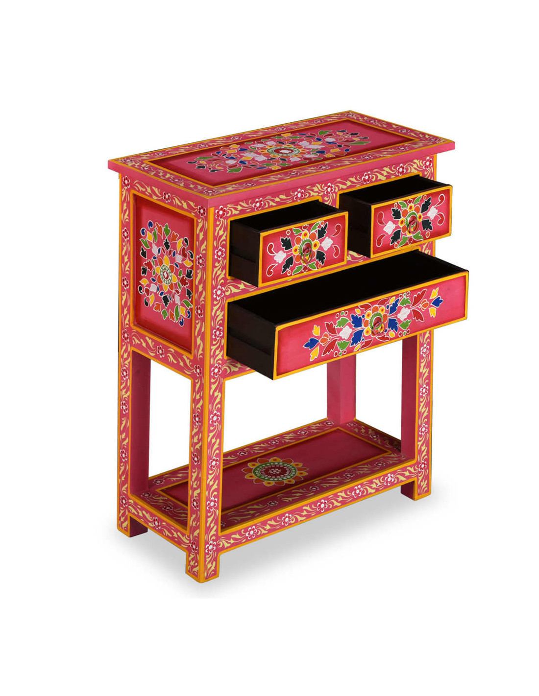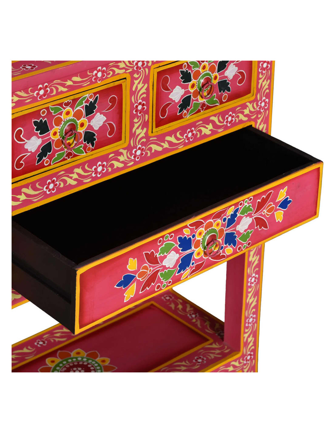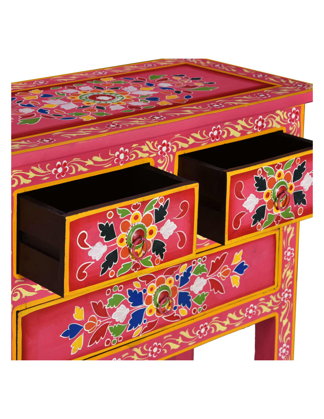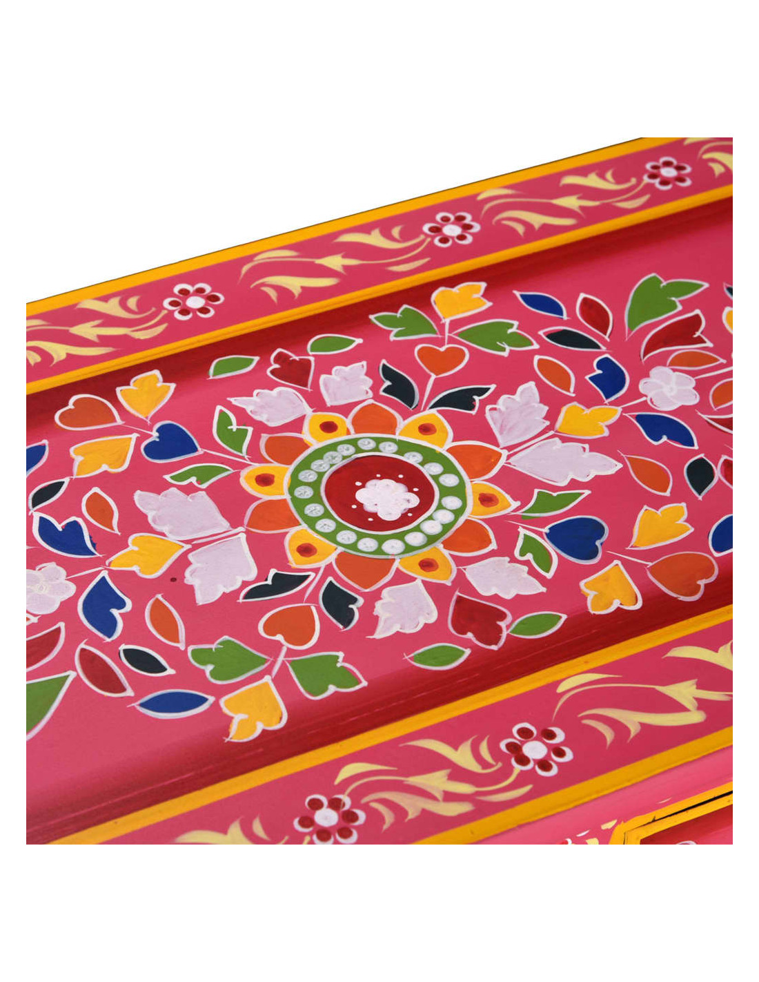 La credenza è realizzata a mano in legno di mango, materiale che è sia resistente che attraente, e la lavorazione artigianale ne sottolinea lo spettacolare stile retrò. Ogni fase della lavorazione, dalla lucidatura alla verniciatura fino alla laccatura, è stata eseguita con la massima cura. La credenza presenta ampi dettagli decorativi, dipinti a mano, che forniscono un carattere caldo e ricco al mobile.