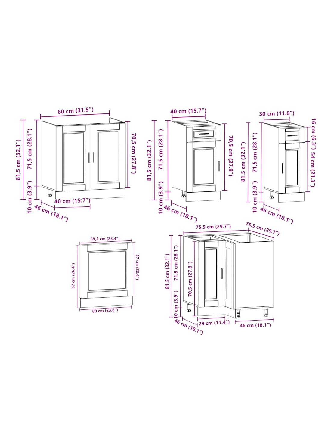 - 1 Mobile base da cucina: 30 x 46 x 81,5 cm (L x P x A)