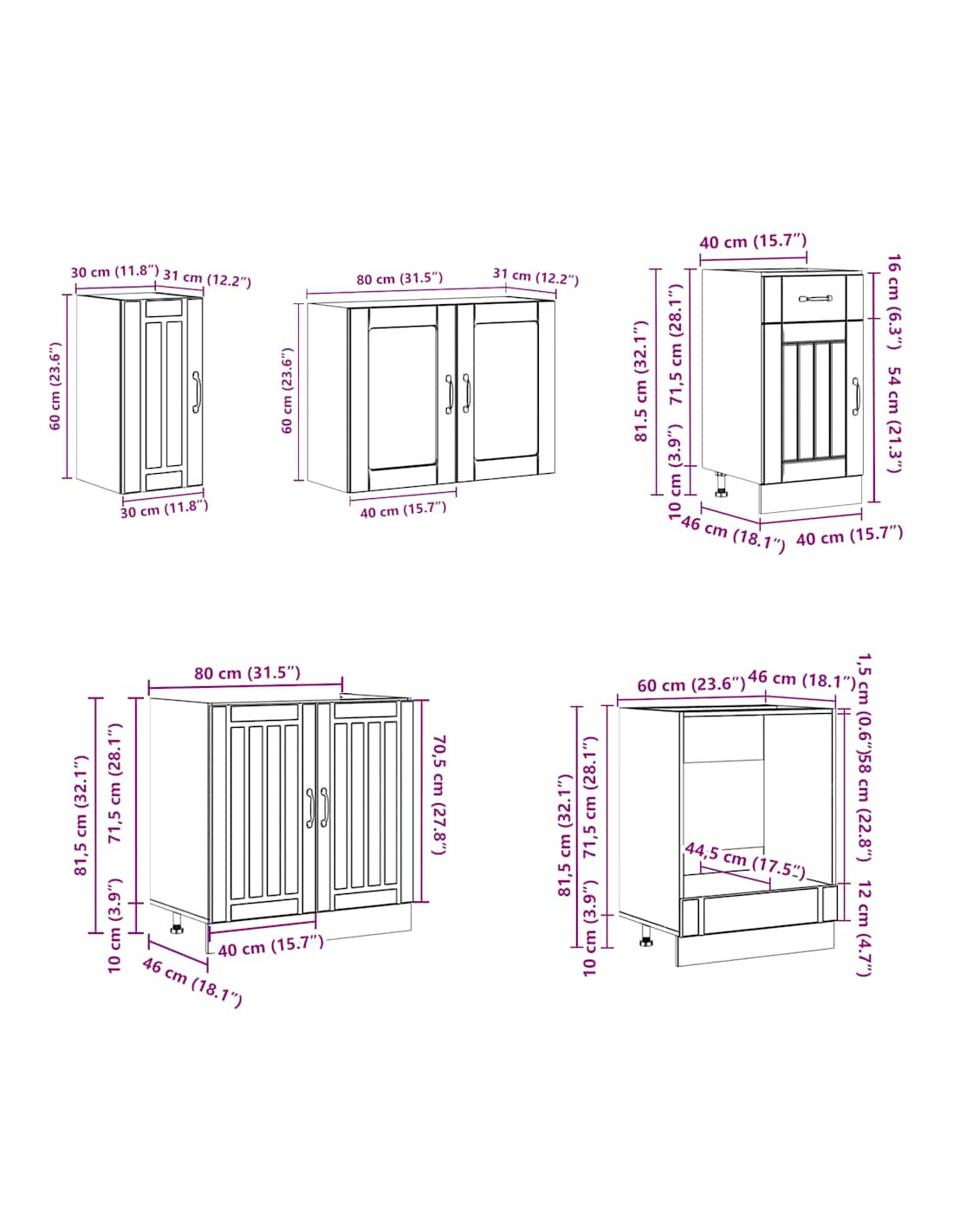- 1 x Mobile base per lavello: 80 x 46 x 81,5 cm (L x P x A)