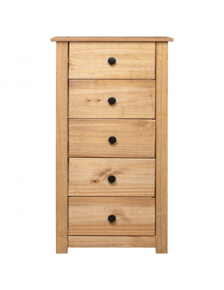 Realizzata in legno massello di pino, questa cassettiera Panama è estremamente resistente e robusta. La credenza offre un ampio spazio di conservazione con 5 cassetti. Inoltre, il robusto piano del tavolo è ideale per esporre oggetti decorativi, cornici per foto o piante in vaso. È facile da pulire con un panno asciutto. Il supporto per telefono è facile da montare.