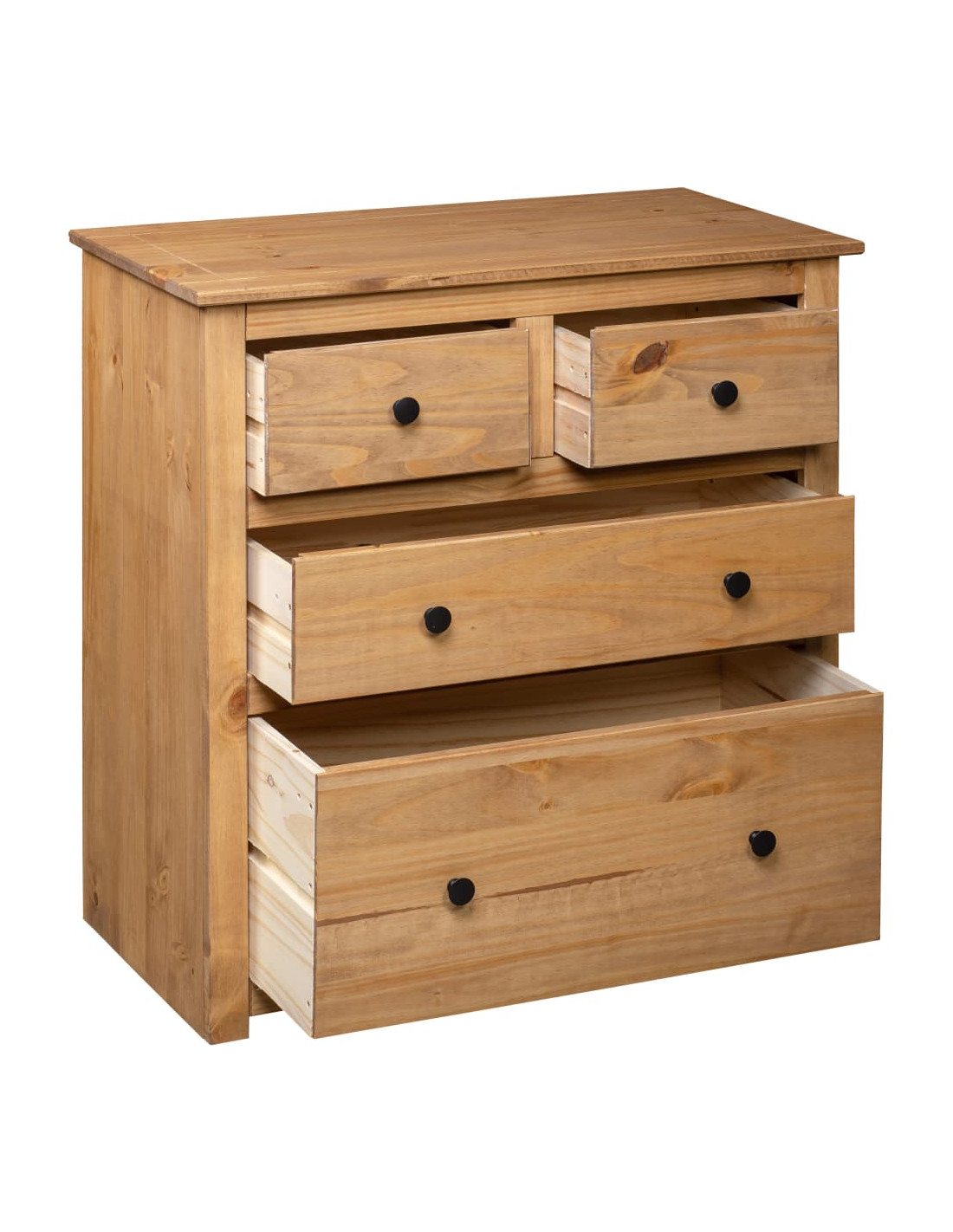 Progettata con 4 cassetti, la credenza mantiene le riviste, i libri, i DVD e i dispositivi multimediali ben organizzati e a portata di mano. Il robusto piano è ideale per posizionare oggetti decorativi come vasi o piante in vaso. L'armadio è realizzato in legno massello di pino. Ogni fase del processo viene effettuata con la massima cura, che si tratti di levigatura, lucidatura, pittura o laccatura. La lavorazione artigianale e le venature del legno esteticamente accattivanti conferiscono ad ogni mobile un tocco sui generis e leggermente diverso dagli altri.