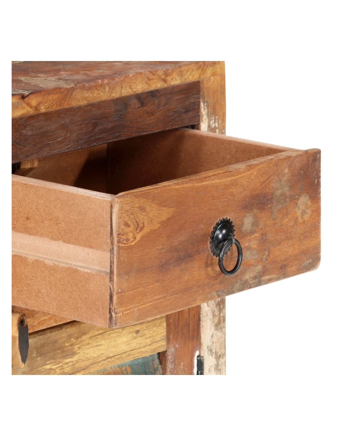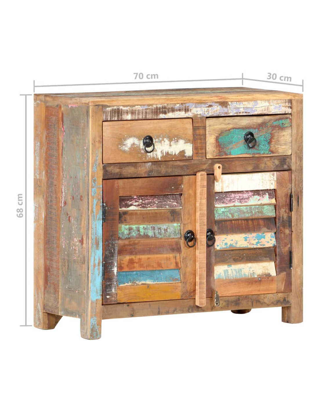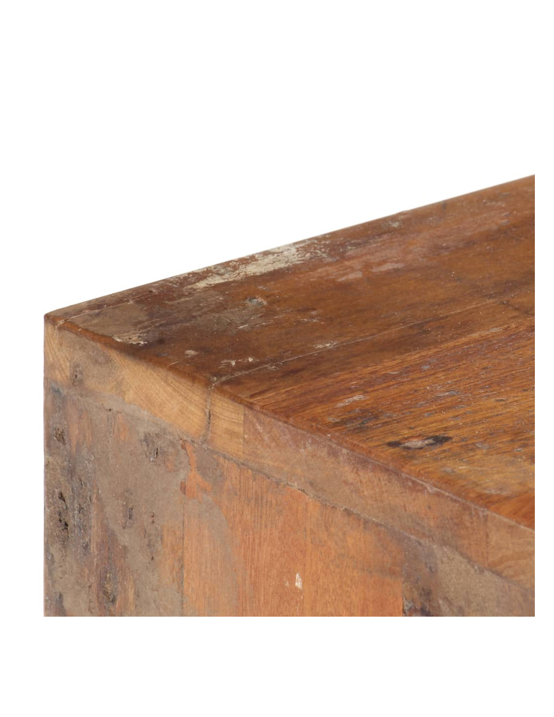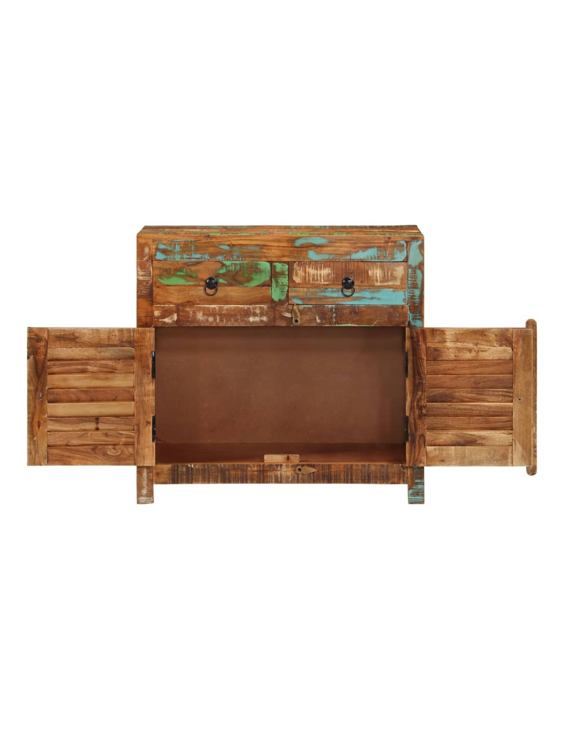 Questo armadietto è realizzato in legno massello di recupero, materiale che ha le caratteristiche di legni diversi, come il mango, il teak, etc. Il robusto piano superiore è ideale per esporre foto, vasi, cesti di frutta o altri oggetti decorativi. I 2 cassetti e le 2 ante offrono ampio spazio dove riporre oggetti vari e mantenerli al riparo dalla polvere e nascosti alla vista.