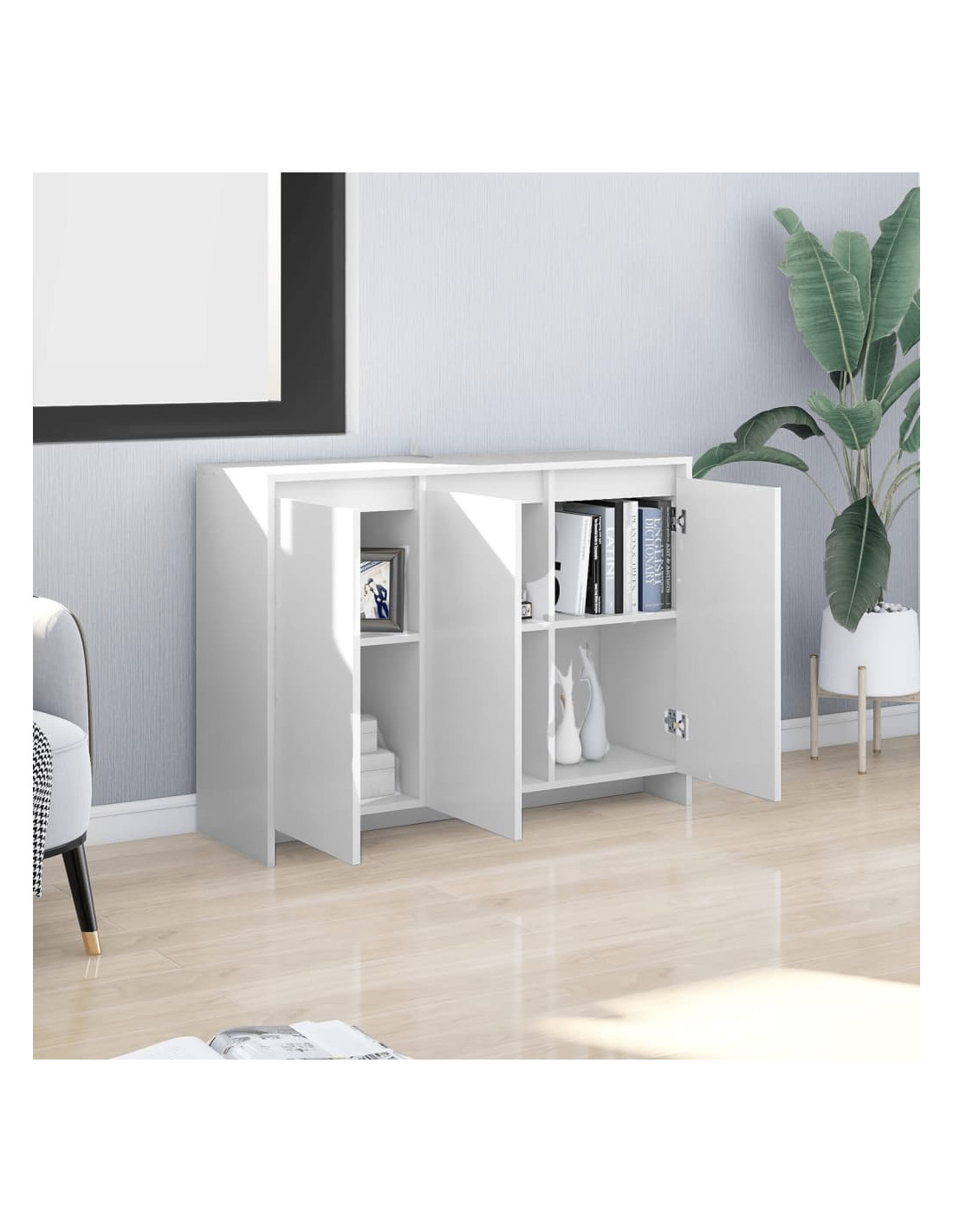 Questa credenza presenta una struttura robusta e durevole. Grazie alle 3 ante, l'armadio offre ampio spazio per riporre libri, apparecchi multimediali e altri oggetti. Il robusto ripiano superiore è ideale per esporre oggetti decorativi, cornici per foto o piante in vaso.