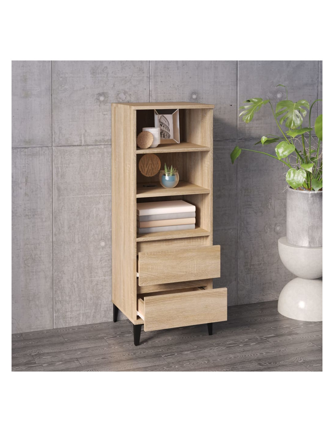 - Piedini in metallo robusto: I piedini in metallo del mobiletto aggiungono uno stile industriale e calmo ai vostri interni, garantendo al contempo stabilità.