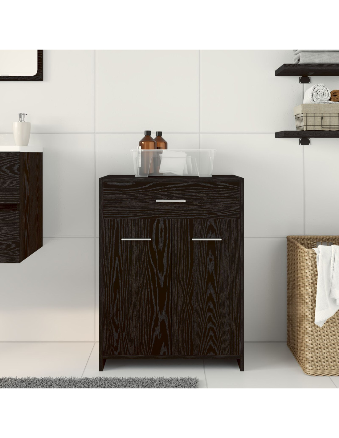 - Costruzione in legno ingegnerizzato: Realizzato in legno ingegnerizzato di alta qualità, resiste bene all'uso quotidiano. Questo materiale garantisce resistenza e lunga durata, contribuendo al look elegante dell'armadietto.