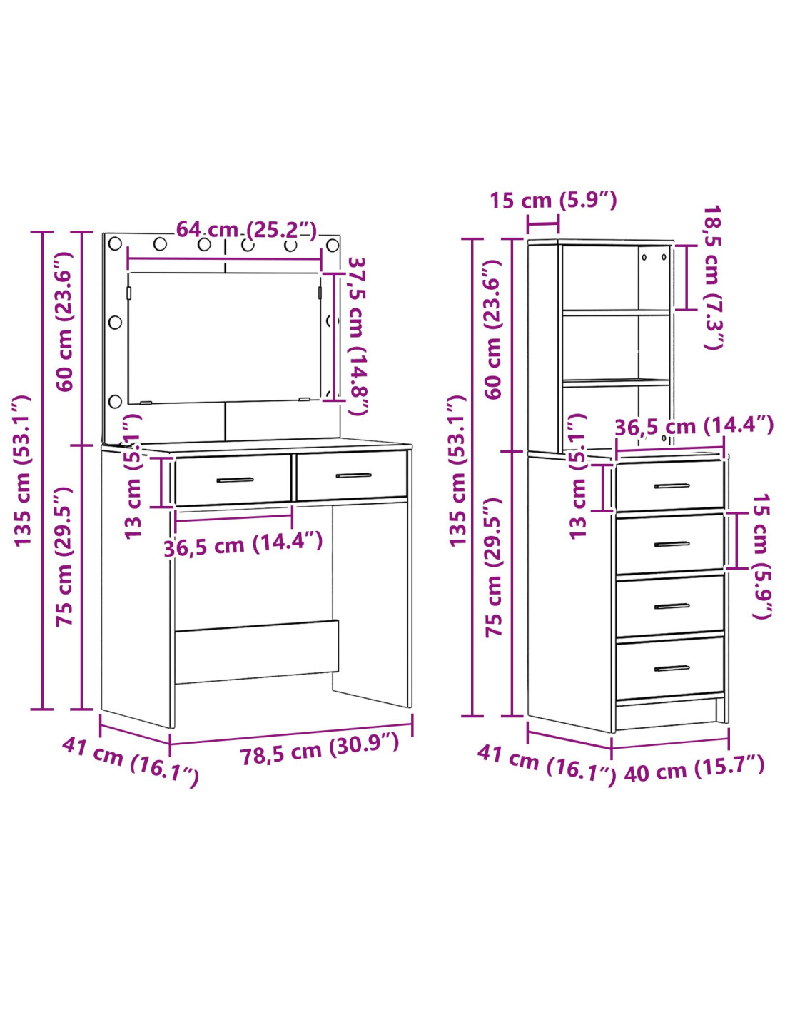 - Manutenzione: Tenerlo in ordine è facilissimo. Basta passarlo con un panno asciutto per mantenerlo in ottime condizioni. Evita prodotti chimici aggressivi per proteggere la sua finitura, assicurando che il tavolo da trucco rimanga un must nella tua casa per anni a venire.
