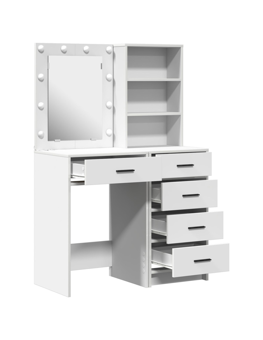 - Componenti Inclusi Ha tante opzioni di archiviazione, come ripiani e cassetti realizzati in legno ingegnerizzato, che aiutano a tenere tutto organizzato. Inoltre, le luci a striscia LED integrate offrono un'illuminazione regolabile per aiutarti a vedere bene mentre ti prepari.