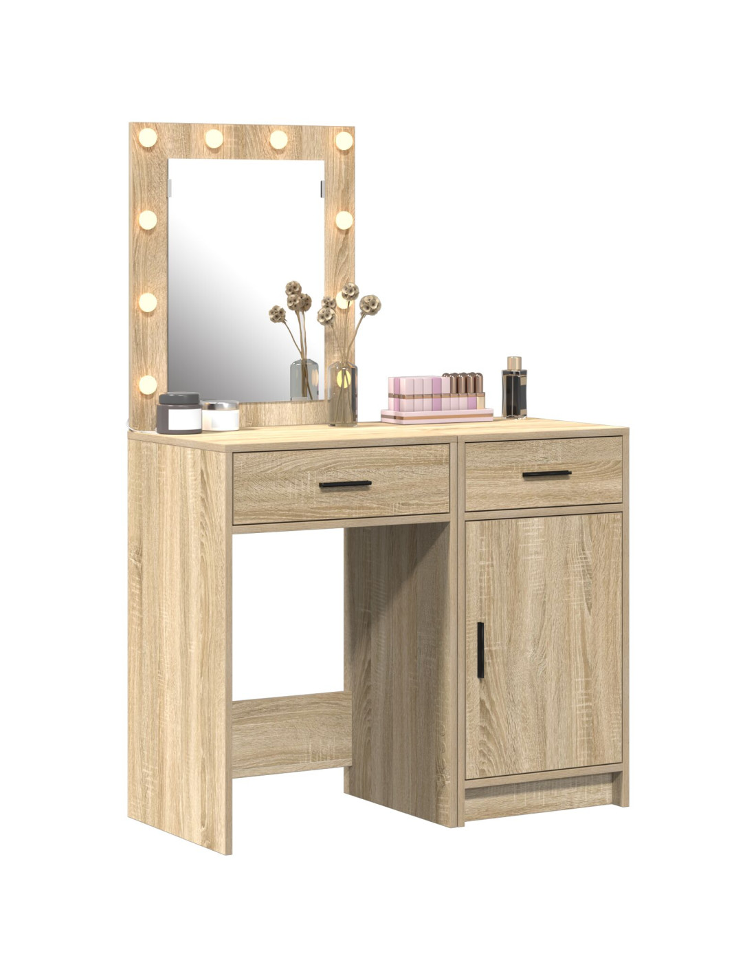 - Materiali: Fatto di legno ingegnerizzato, questo tavolo da trucco è robusto e ha una finitura liscia che è bella e facile da pulire. Bilancia estetica e durabilità, rendendolo un punto di riferimento in qualsiasi camera da letto.