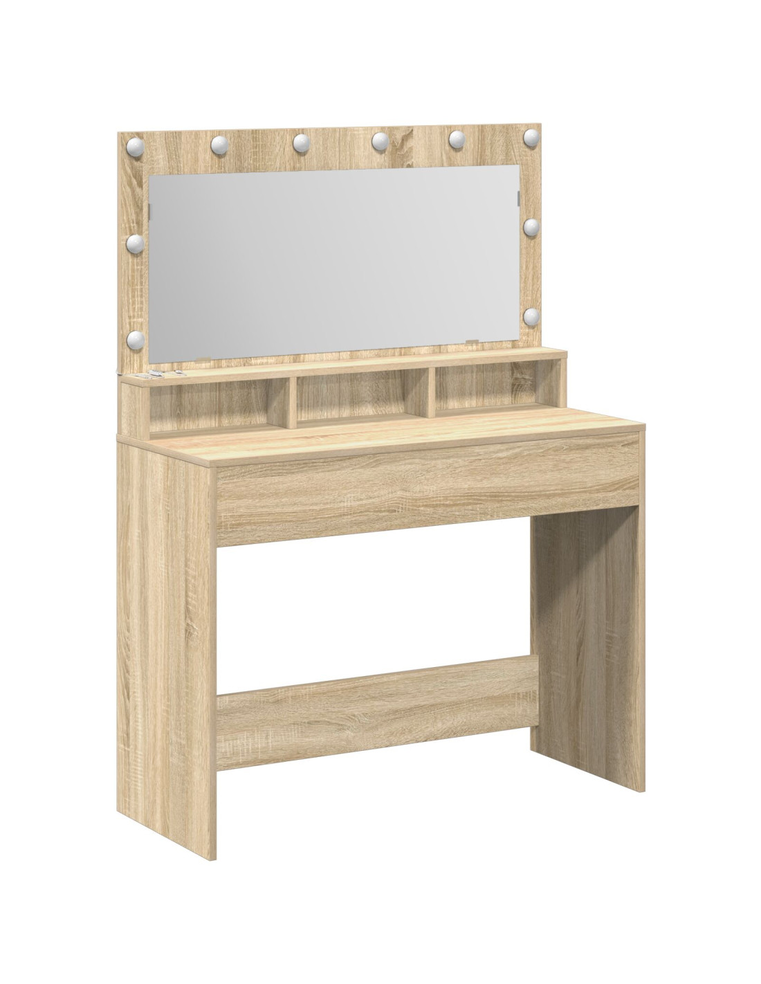 - Componenti inclusi: Il tavolo include mensole per stoccaggio flessibile per vari oggetti, dai cosmetici a decorazioni. Viene fornito con uno specchio piatto e luci LED, formando una stazione di bellezza completa. Lo specchio garantisce riflessi chiari mentre le luci offrono un'illuminazione costante.