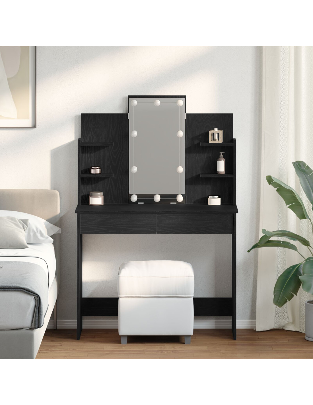 - Materiali di qualità: Fatto in legno ingegnerizzato di alta qualità, questo tavolo da trucco è costruito per durare. La superficie liscia e la finitura opaca gli danno un aspetto raffinato, mentre la solidità assicura che resista all'uso quotidiano mantenendo la sua bellezza.