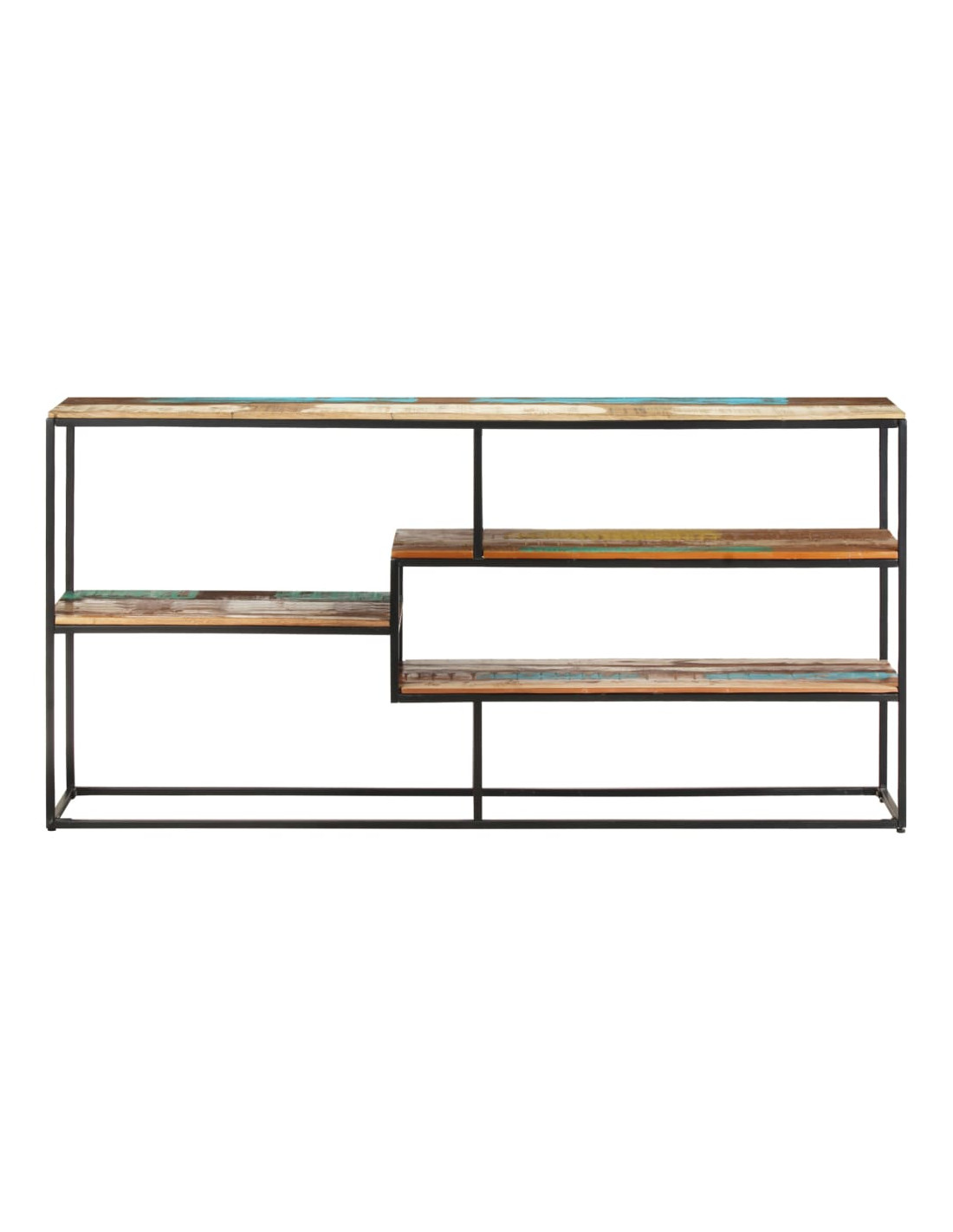 Il mobile è realizzato in legno massello di recupero. Può essere costituito da diversi tipi di legno come teak, legni duri, legni tropicali, legno di mango, ecc. Ciò significa che il legno di recupero conserva le caratteristiche di questi diversi tipi di legno e ogni mobile risulta unico e diverso dal successivo. Il ripiano ha una eccellente resistenza ed è facile da pulire. Il telaio in acciaio verniciato a polvere conferisce uno stile industriale. Dotato di diversi scomparti aperti, questo armadio offre ampio spazio per conservare o mettere in esposizione svariati oggetti, come vasi di fiori, cestini per la merenda, libri, trofei, ecc.