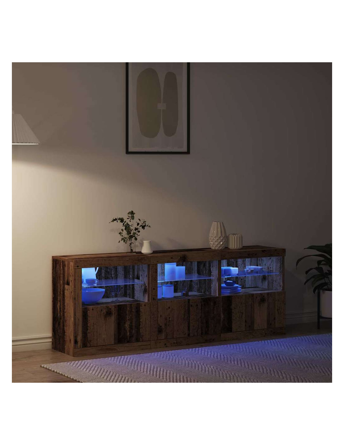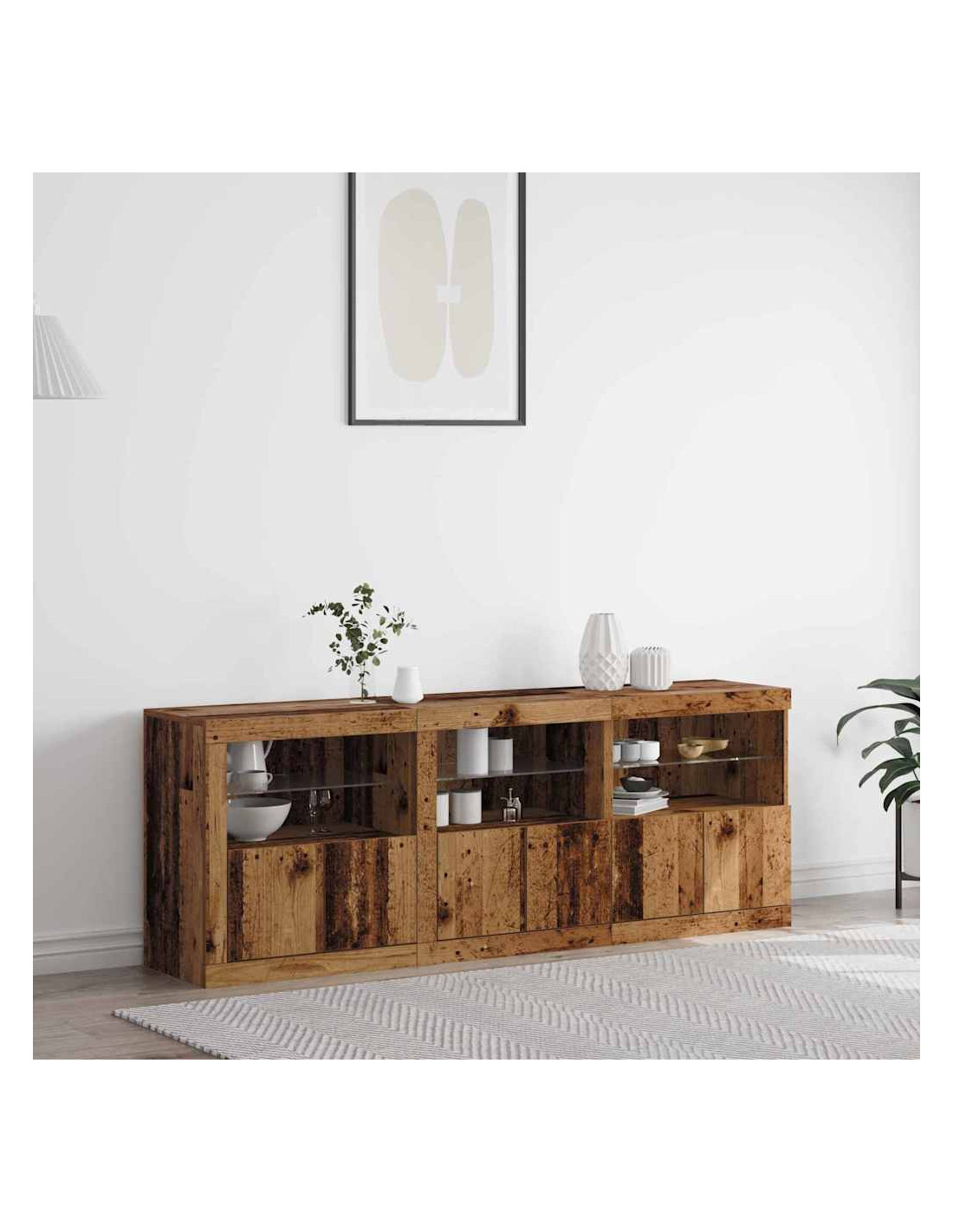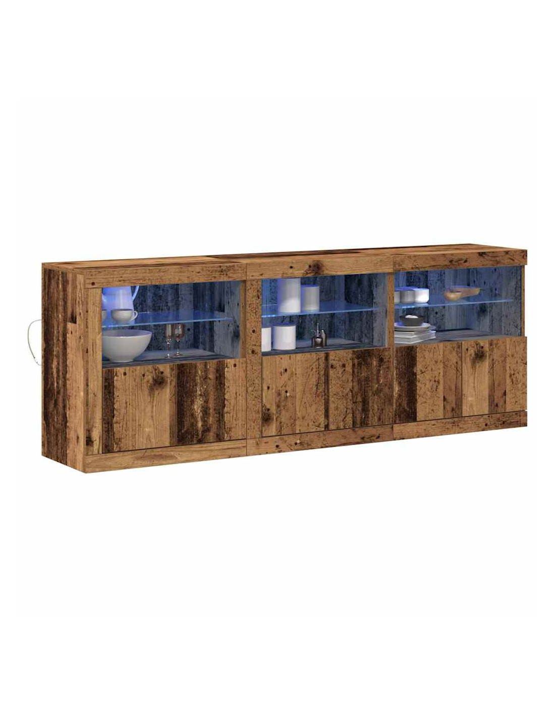 - Illuminazione LED: Con strisce LED integrate, questa credenza crea un'illuminazione morbida e accogliente che mette in risalto gli oggetti esposti. Le luci si alimentano tramite USB, promettendo efficienza energetica e facilità di connessione, mentre un pulsante rende l'operazione semplice, migliorando l'eleganza funzionale dell'unità.