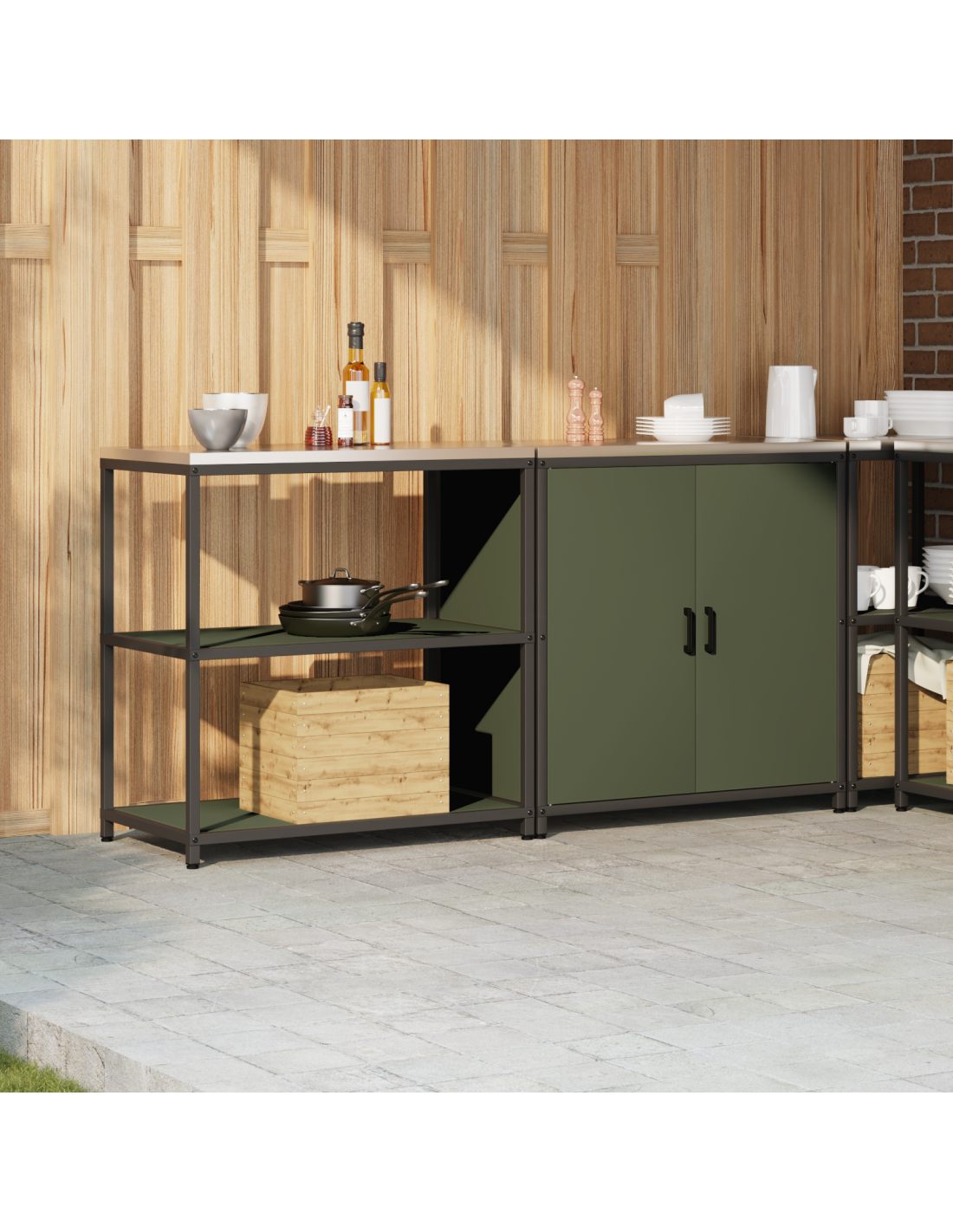 - Stoccaggio funzionale: Con scompartimenti ben organizzati, questa unità è pensata per un uso pratico. Le mensole interne permettono di sistemare cibo, utensili e altre necessità della cucina in modo conveniente. La loro regolabilità si adatta a tutte le esigenze di spazio, da pentole a piatti.