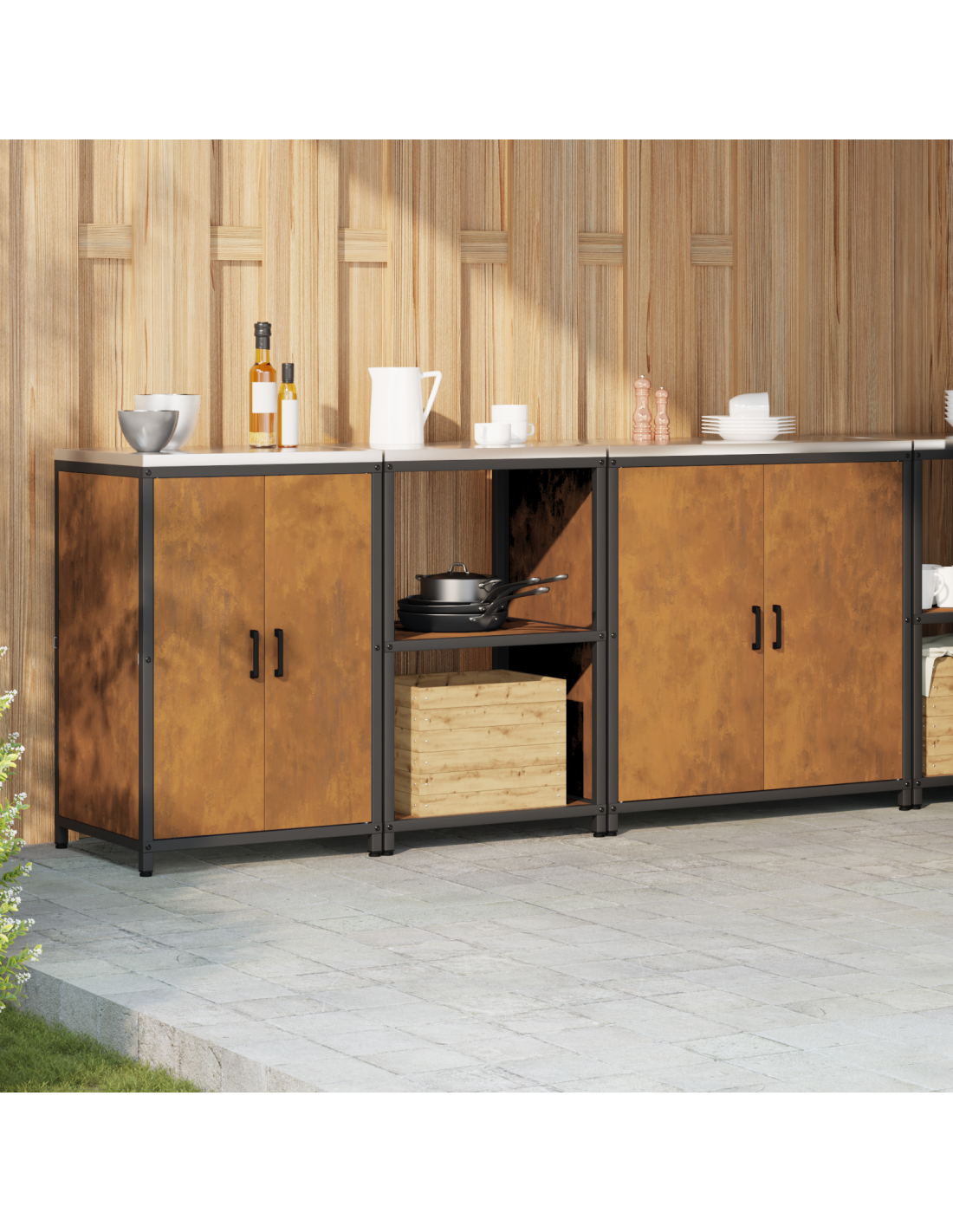 - Componenti inclusi: L'armadietto ha diversi scaffali e scomparti progettati per riporre diverse cose da cucina. Con scaffali aggiuntivi in acciaio, la durata della struttura è migliorata, e le porte sono forti e sicure.