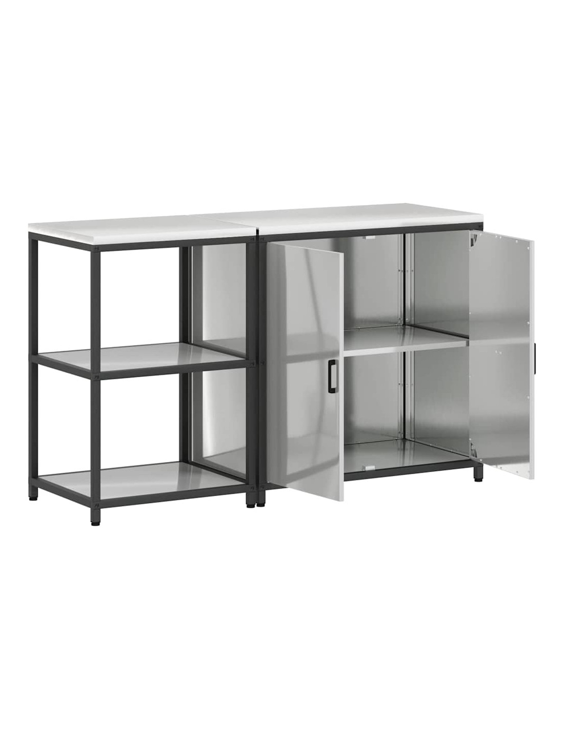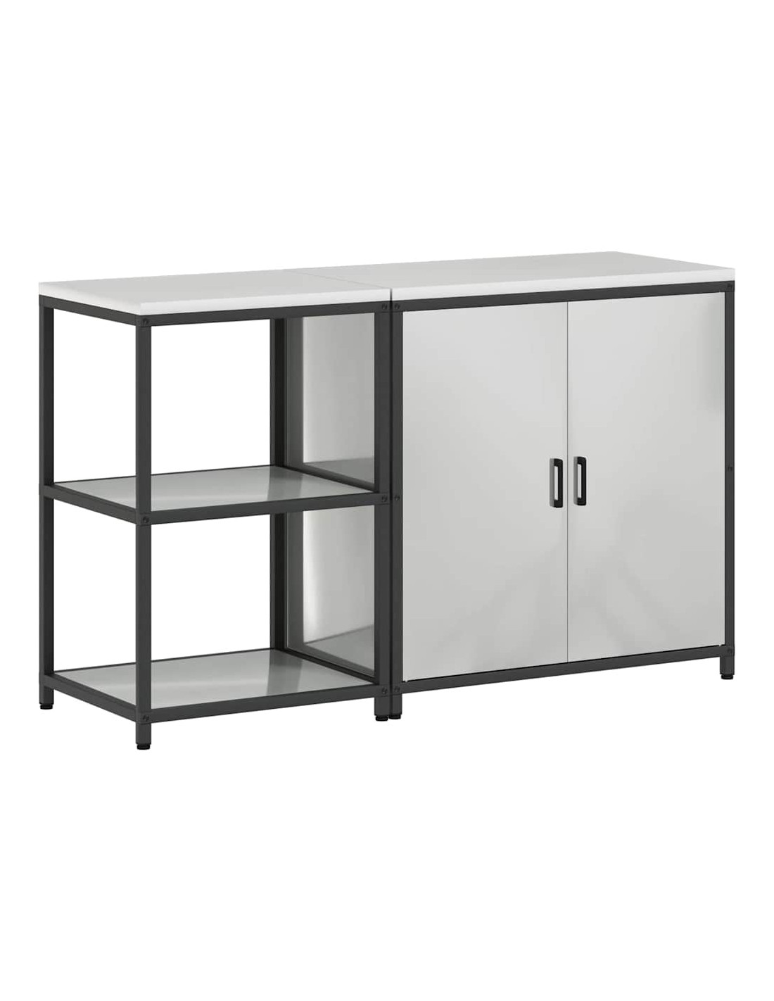 - Componenti inclusi: Ogni elemento di questa unità ha una funzione pratica. Dotata di porte e mensole in acciaio, offre longevità e un facile accesso a tutto ciò che contiene. Le maniglie e le gambe nere mantengono un aspetto armonioso, rendendola ancora più elegante. Il design rettangolare ottimizza lo spazio, rendendo la cucina più funzionale.