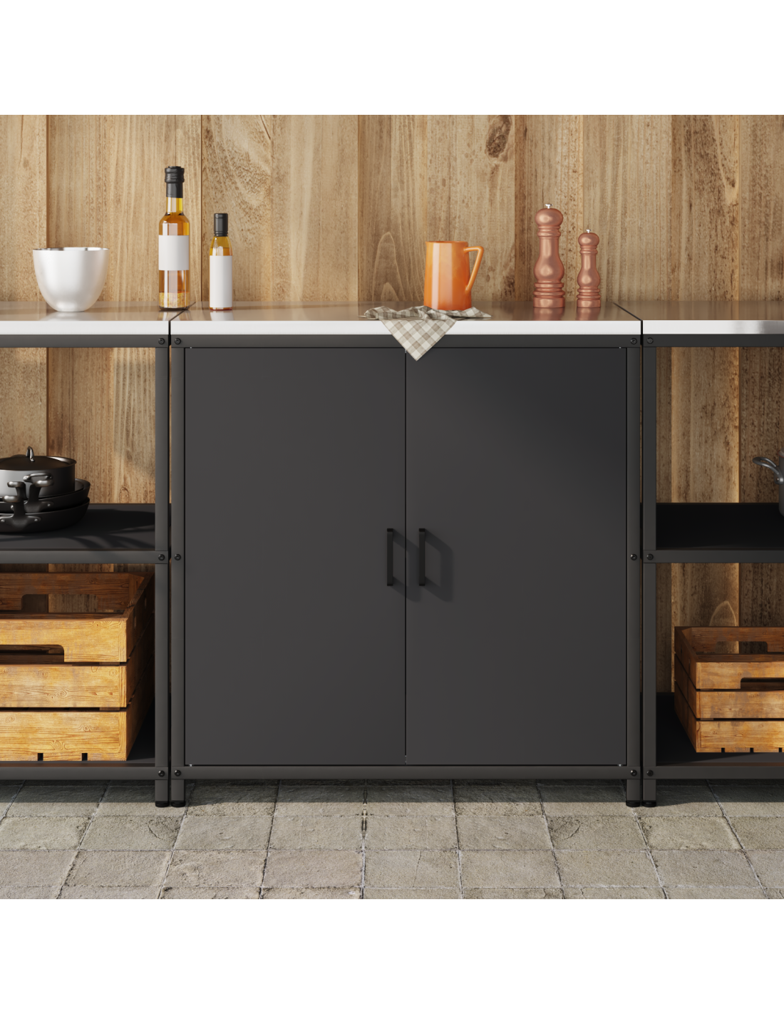- Ripiani Versatili Con diversi ripiani, questa unità ti offre tanto spazio per riporre tutto, da cibo a utensili. I ripiani possono sostenere materiali come MDF e offrono un'opzione comoda e flessibile per mantenere la tua cucina organizzata.
