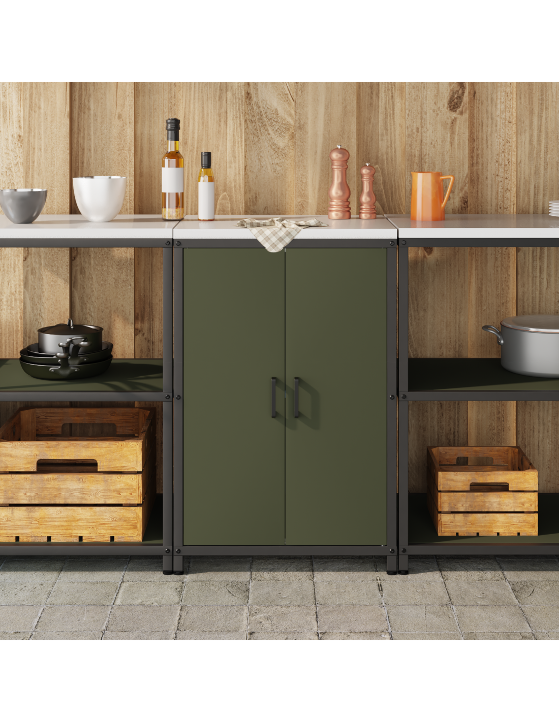 - Ripiani Versatili Con diversi ripiani, questa unità ti offre tanto spazio per riporre tutto, da cibo a utensili. I ripiani possono sostenere materiali come MDF e offrono un'opzione comoda e flessibile per mantenere la tua cucina organizzata.