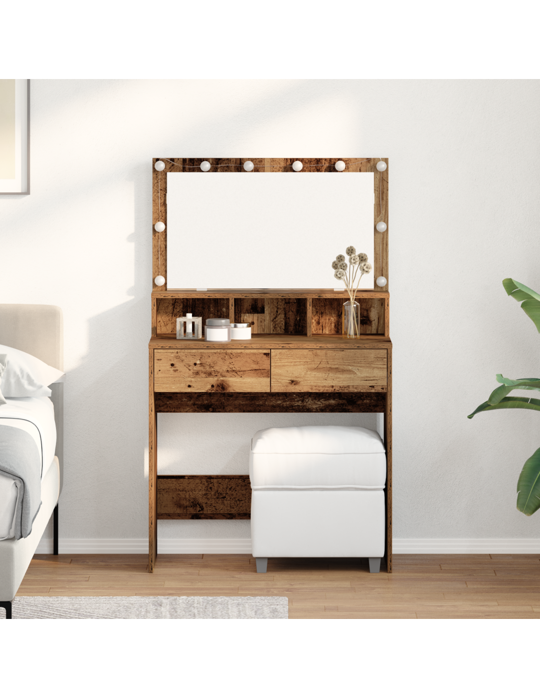 - Legno ingegnerizzato: Realizzato in legno ingegnerizzato, questo tavolo da trucco è robusto e duraturo. La superficie è liscia e semplice, perfetta per un look moderno.