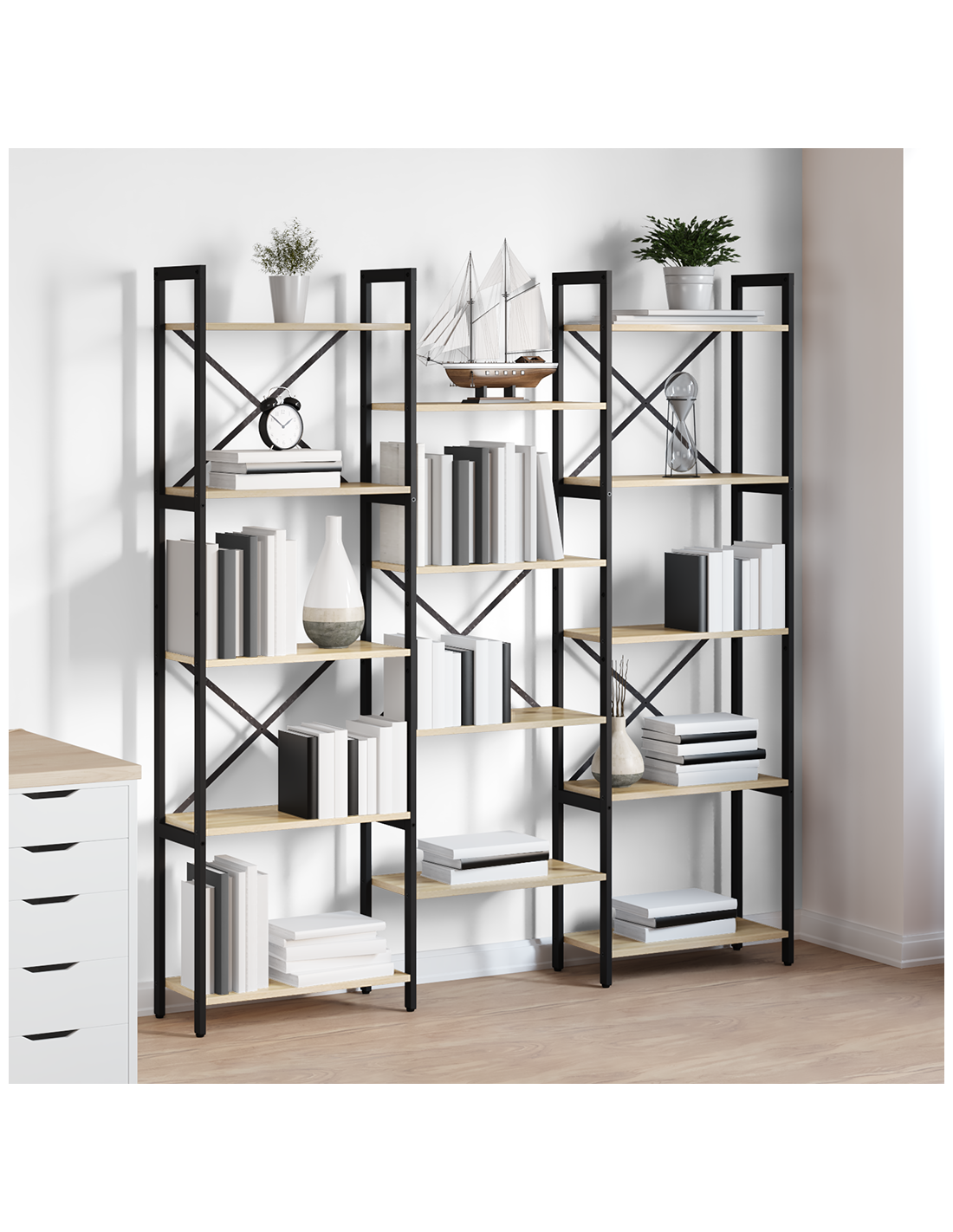 - Design a ripiani multi-livello: La forma multi-livello permette di organizzare oggetti in modo efficiente, accogliendo articoli di altezze diverse, da vasi a romanzi. Questo design unico facilita la categorizzazione delle collezioni, trasformando l'esposizione di libri in un'espressione artistica del tuo gusto.