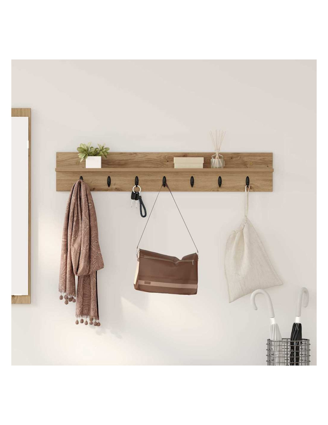 Questo appendiabiti da parete è un'aggiunta pratica e di stile a qualsiasi corridoio moderno. Unisce design e funzionalità, con una struttura in legno ingegnerizzato che si integra perfettamente in ambienti contemporanei. Ideale per risparmiare spazio a terra, offre tante opzioni di stoccaggio per tenere tutto in ordine e senza confusione. Legno ingegnerizzato elegante: Questo appendiabiti porta un look contemporaneo al tuo corridoio. È resistente e durevole, ed è progettato per durare nel tempo, con una finitura liscia che migliora l'estetica. È robusto e può reggere vari capi, offrendo una soluzione sicura per le tue esigenze di stoccaggio. Pratico e salvaspazio: Con il suo design a parete, il rack ti permette di risparmiare spazio a terra, ideale anche per corridoi stretti. Ti aiuta a mantenere l'ambiente ordinato, creando uno spazio efficiente per cappotti, cappelli e accessori. Ganci resistenti: Con ganci robusti, questo appendiabiti tiene sicuri vari oggetti. Sono posizionati in modo strategico per massimizzare lo spazio, così puoi appendere cappotti, sciarpe e borse senza che ci sia disordine. La loro solidità assicura che rimangano sempre al loro posto. Facile da montare: Questo appendiabiti moderno è semplice da assemblare, basta che ci siano due persone e un cacciavite. Il processo è veloce e ti assicura un rack stabile che si integra bene nel tuo spazio. Focalizzato sul corridoio: Pensato per il tuo corridoio, questo rack è pronto per tenere a portata di mano le cose più importanti quando esci o entri. Il suo design moderno si abbina a vari stili, migliorando tanto la bellezza quanto la funzionalità del tuo ingresso.
