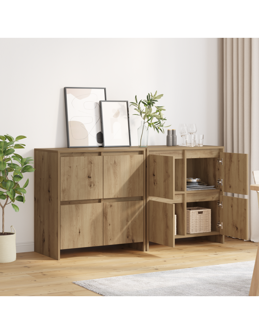 Questo armadio moderno e smart è un ottimo modo per mettere in ordine il tuo spazio, migliorando l'aspetto del tuo ambiente. Con la sua superficie liscia e la forma rettangolare, ha linee pulite che gridano eleganza, rendendolo un'aggiunta perfetta a qualsiasi stanza. Che ti serva per le stoviglie in sala da pranzo o per i libri in soggiorno, unisce funzionalità e stile, offrendoti tanto spazio di archiviazione in un pacchetto elegante. Il design minimalista e il robusto legno ingegnerizzato lo rendono ideale per una cenetta in famiglia o per l'organizzazione quotidiana.