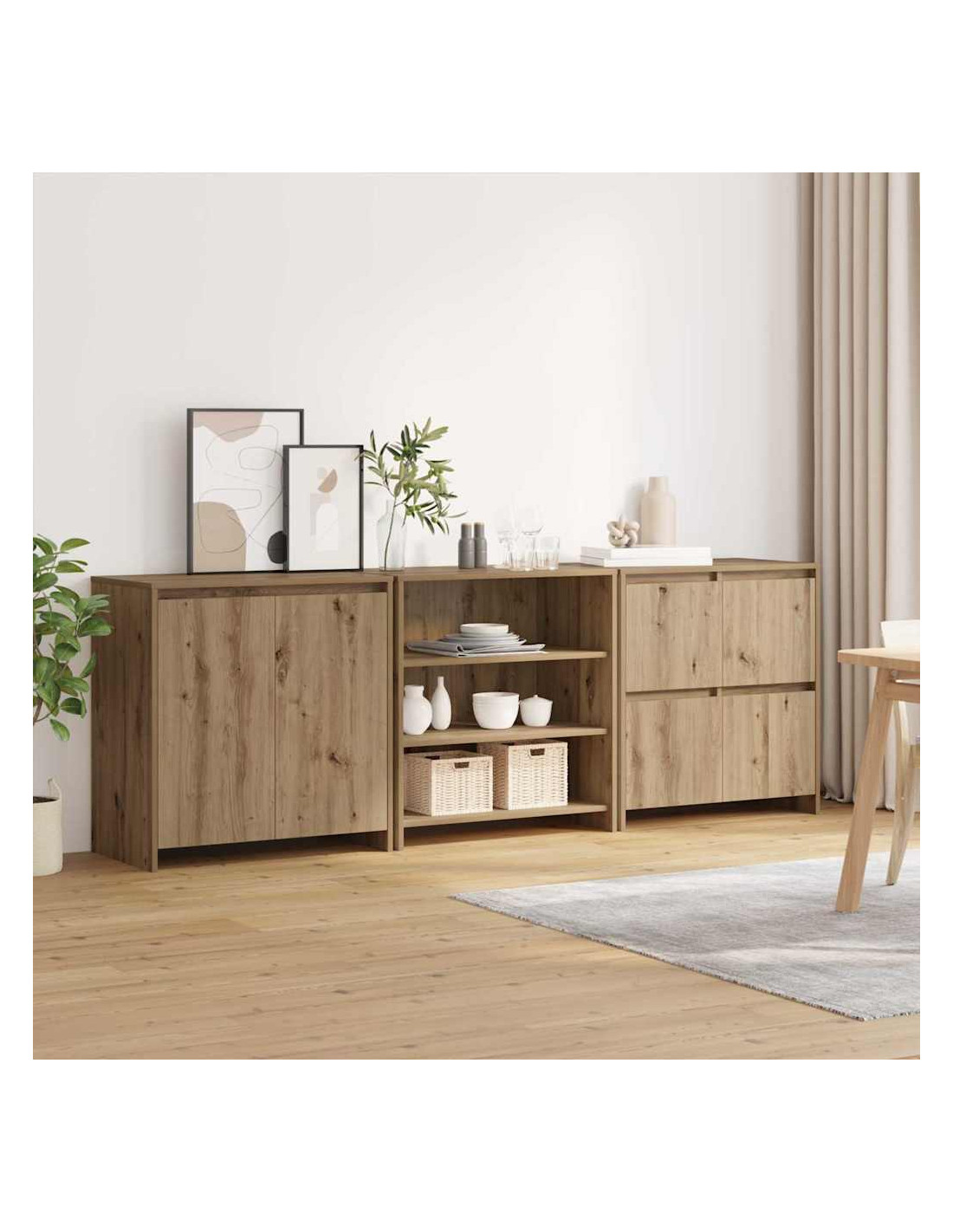 Questo mobile versatile è un perfetto esempio di design contemporaneo, ideale per chi cerca praticità e semplicità per la casa. Si integra bene in sale da pranzo e soggiorni, con una finitura in legno ingegnerizzato che dona un tocco moderno e ordinato. Offre soluzioni di stoccaggio ottimali per spazi che richiedono eleganza e ordine, adattandosi perfettamente a chi apprezza il minimalismo combinato con l'utilità.