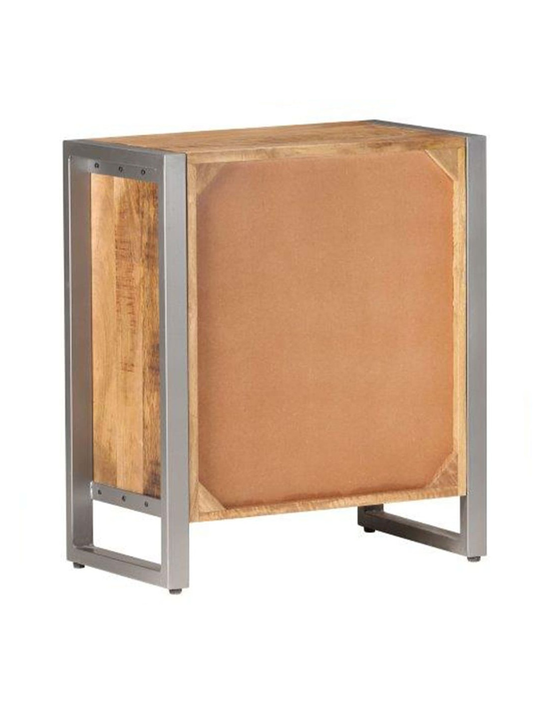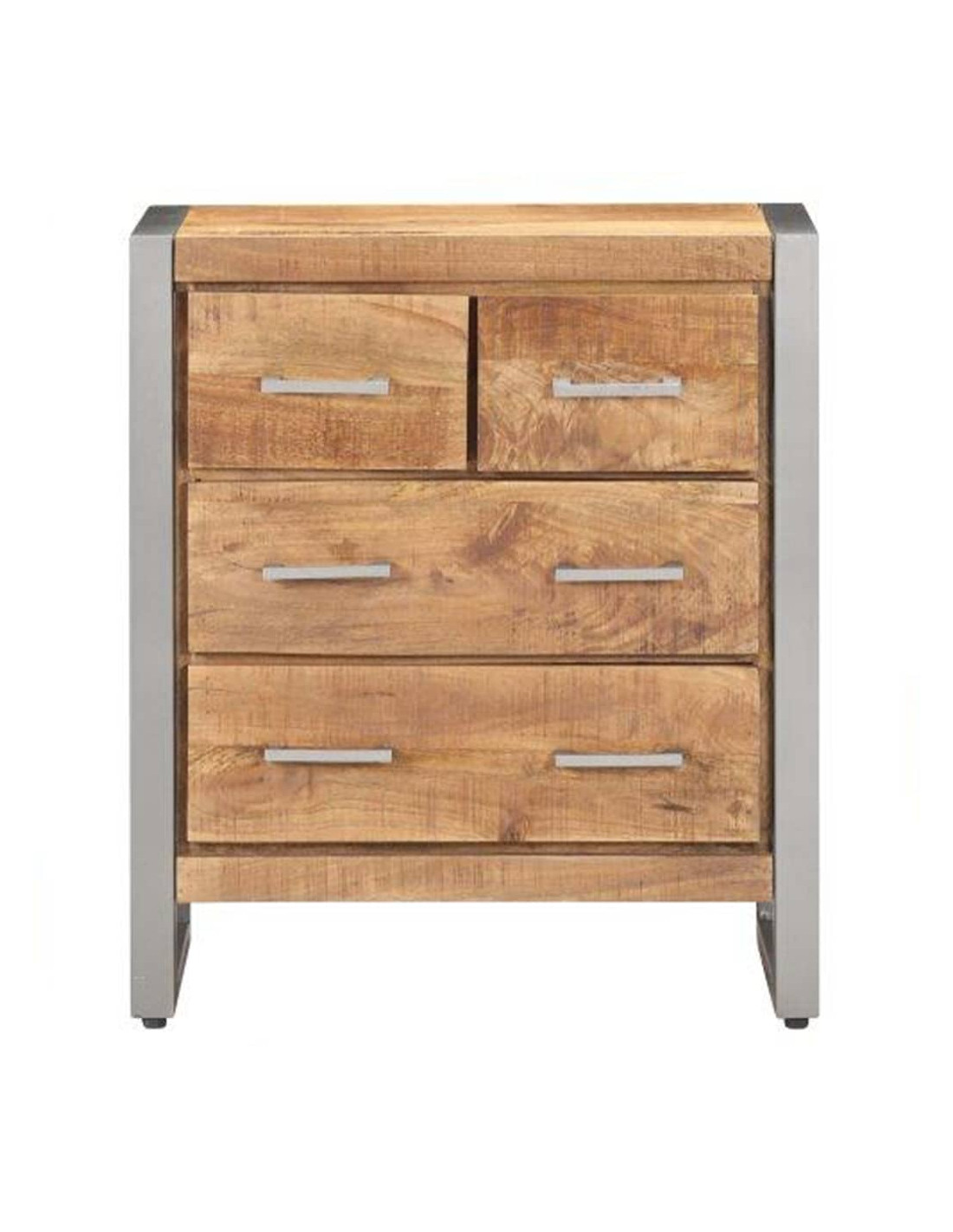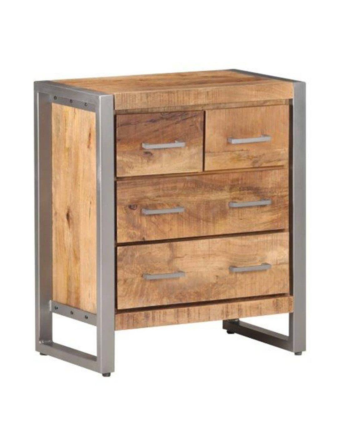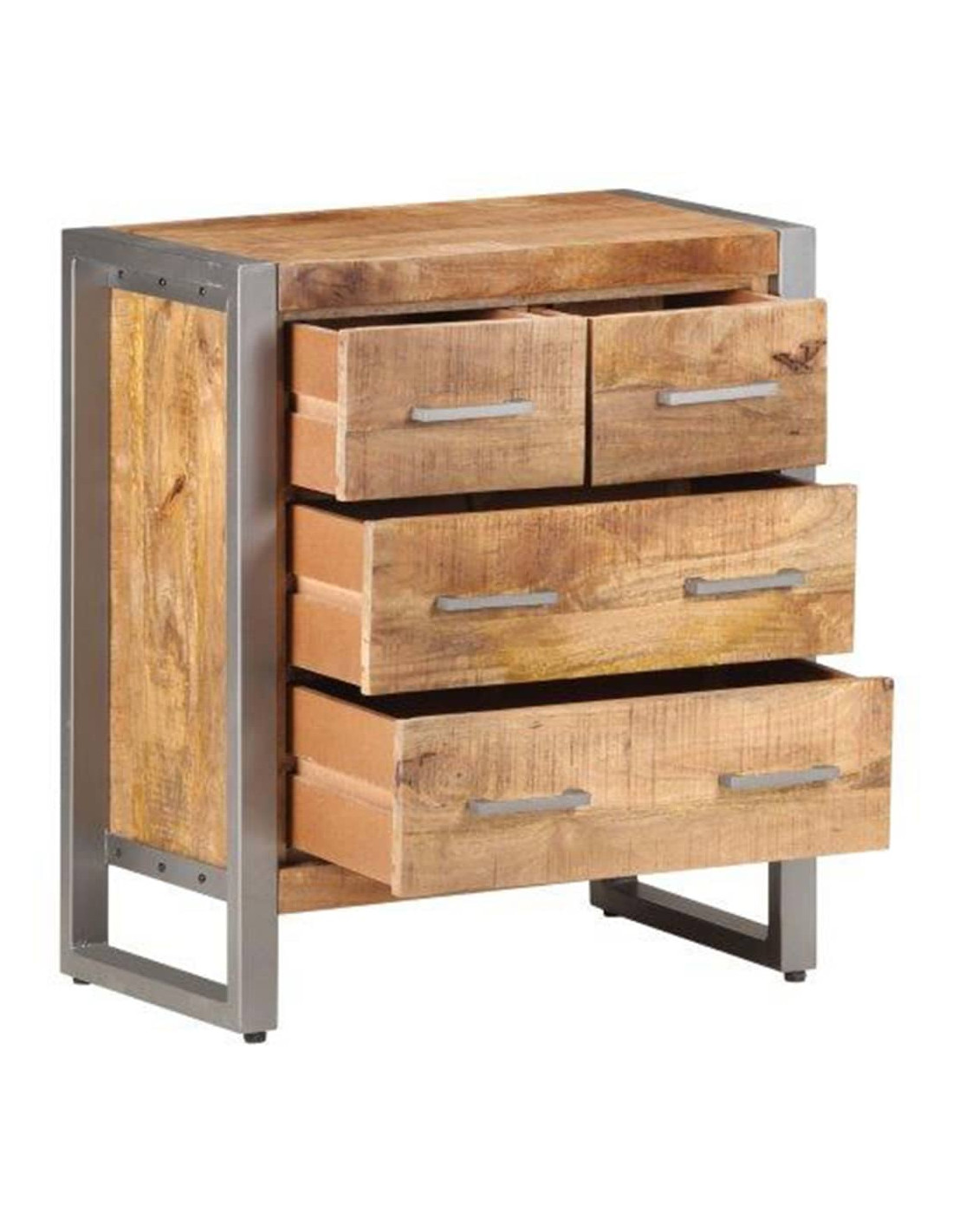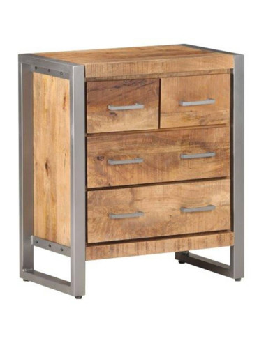 Il mobile laterale è realizzato in legno di mango grezzo, un legno duro tropicale con la forza di sopportare il peso. Inoltre resiste all'usura del tempo, essendo stabile e durevole. Il telaio in ferro aggiunge anche una maggiore stabilità. Questo armadio è dotato di quattro cassetti che offrono ampio spazio di stoccaggio. Inoltre, il robusto piano è ideale per esporre oggetti decorativi come foto, piante in vaso, vasi, ecc.