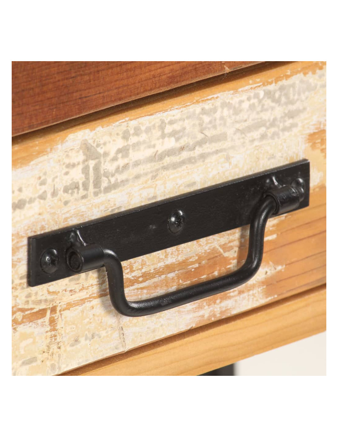 Questo mobile di stoccaggio è realizzato in legno massello di recupero che è stato ricavato da travetti, pavimenti e travi di supporto di vecchi edifici demoliti e può essere costituito da diversi tipi di legno come il pino, il teak, il faggio, la quercia, il cedro, il mango, l'acacia, ecc. Ciò significa che il legno di recupero conserva le caratteristiche di questi diversi tipi di legno. Il legno di recupero è già invecchiato, stagionato ed essiccato, quindi non si restringe o si piega. Questa consolle è completamente realizzata a mano e le bellissime venature del legno rendono ogni mobile unico e leggermente diverso dagli altri. La resistente struttura in ferro verniciato a polvere aumenta la sua robustezza. Il robusto piano è ideale per esporre oggetti decorativi, come cornici per foto o piante in vaso. Inoltre, la consolle è dotata di 2 cassetti e 2 ripiani, così potete tenere libri, riviste e altri oggetti ben organizzati e a portata di mano.