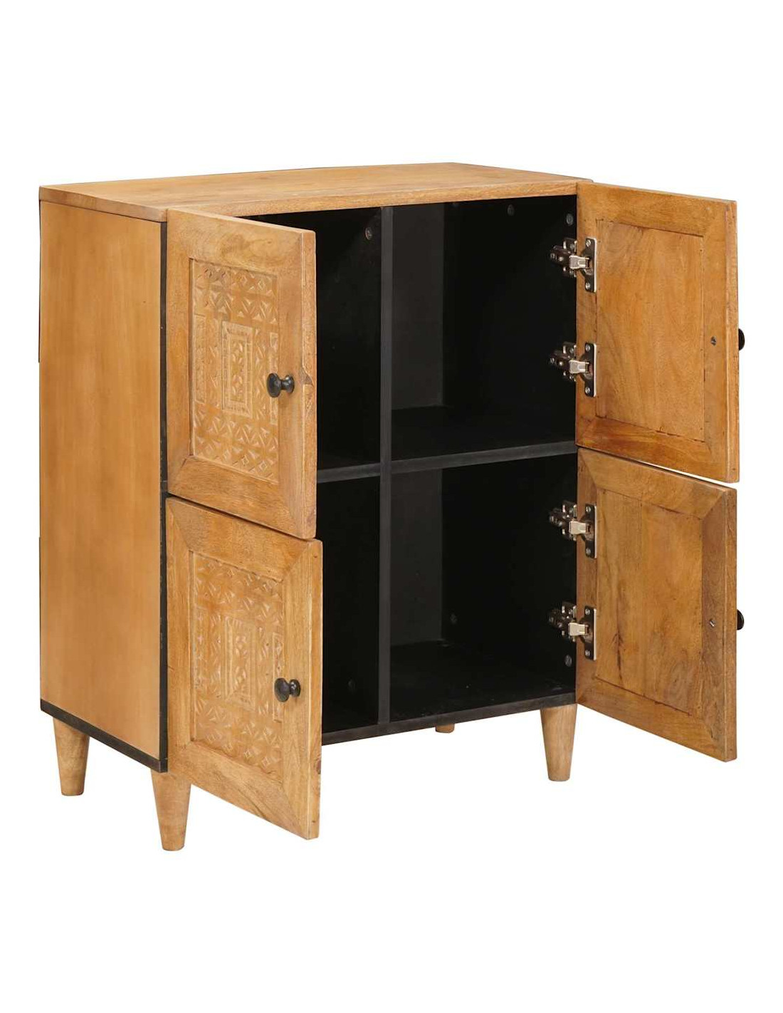 - Componenti Inclusi: Il sideboard ha porte a filo con superficie liscia e manopole nere. Non solo funzionano bene, ma danno anche un tocco moderno al design. Le gambe, fatte in legno di mango massello, offrono una base forte per tenerlo stabile.