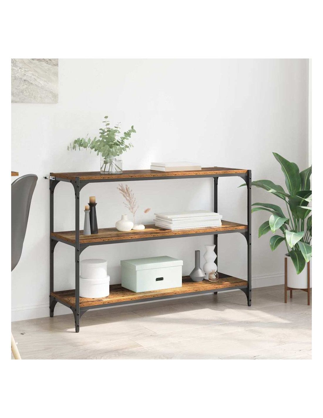 - Struttura in ferro durevole: Il telaio in ferro assicura stabilità e forza. Il colore nero accentua l'estetica mentre rinforza la costruzione. Grazie al ferro, la libreria è un pezzo di arredamento duraturo che promette soddisfazione nel tempo.