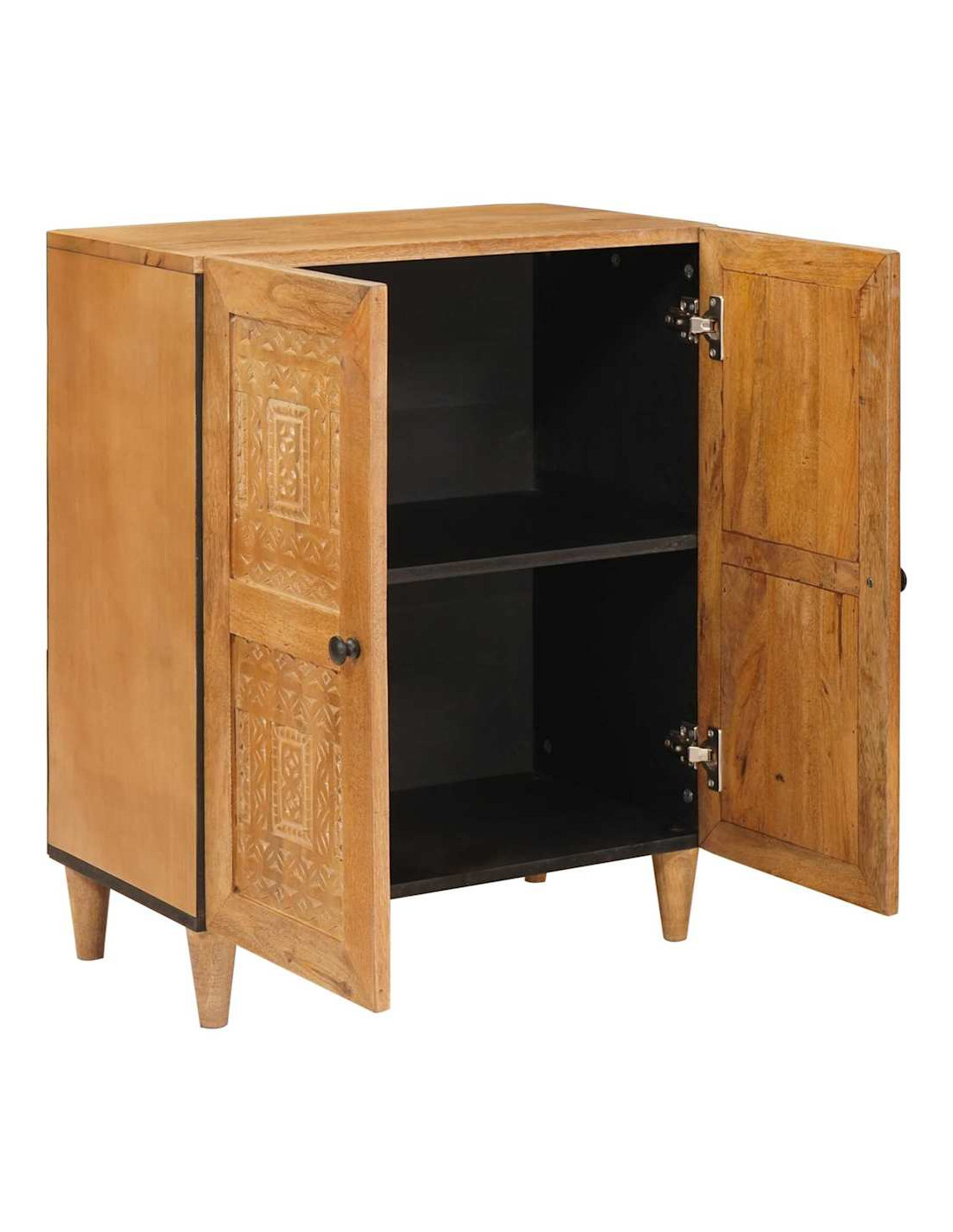 - Costruzione in Legno Massello di Mango: Questa credenza è fatta in legno massello di mango, il che la rende robusta e duratura. La sua venatura naturale dà un'atmosfera accogliente all'ambiente. Perfetta per cucine, sale da pranzo o soggiorni che richiedono un bel posto dove riporre le cose.