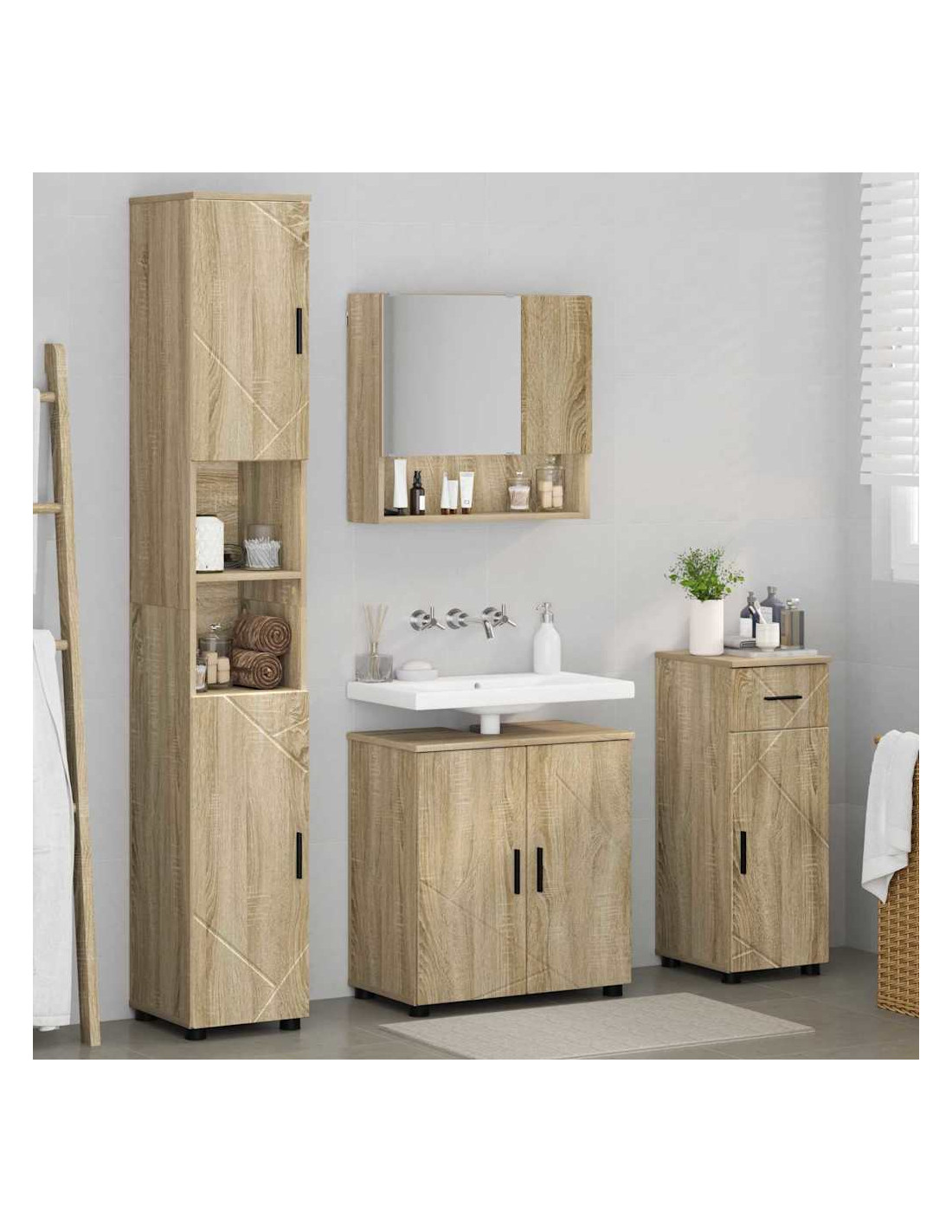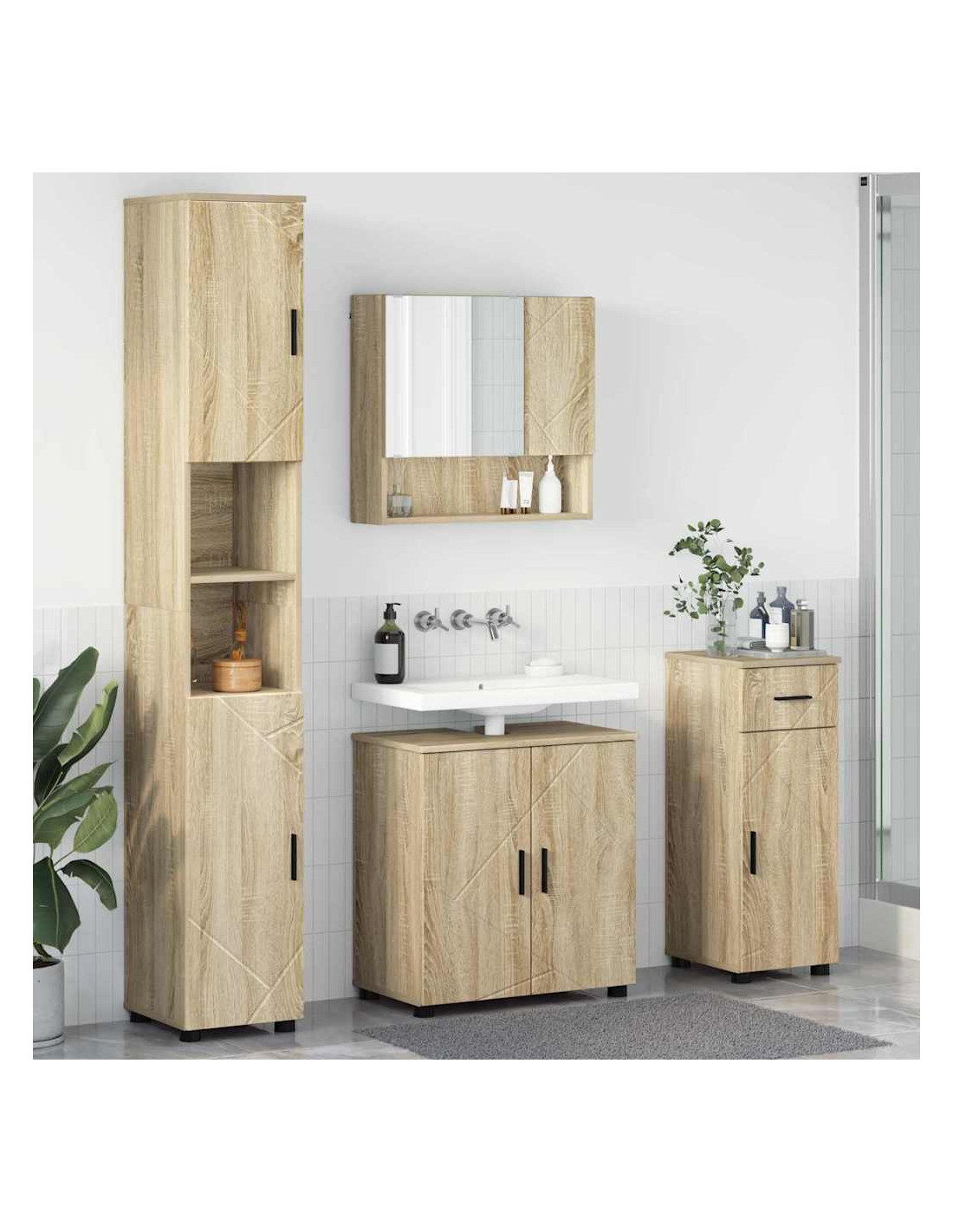 - Costruzione in legno ingegnerizzato: Questo set di mobili è fatto principalmente in legno ingegnerizzato, una scelta robusta ed eco-friendly per i bagni. La sua struttura resiste bene all'umidità, perfetto per le tue esigenze in bagno.