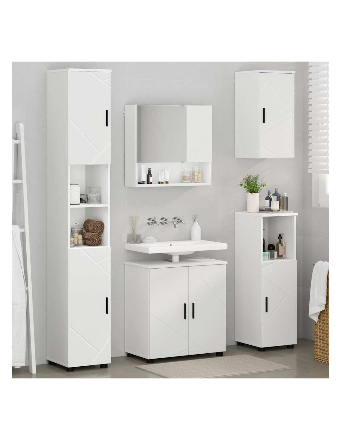 - Montaggio a Parete Salva Spazio Montato a parete, questo set libera spazio prezioso sul pavimento. È semplice da installare e offre un ottimo spazio di stoccaggio, adatto per bagni più piccoli o per chi vuole un look ordinato.