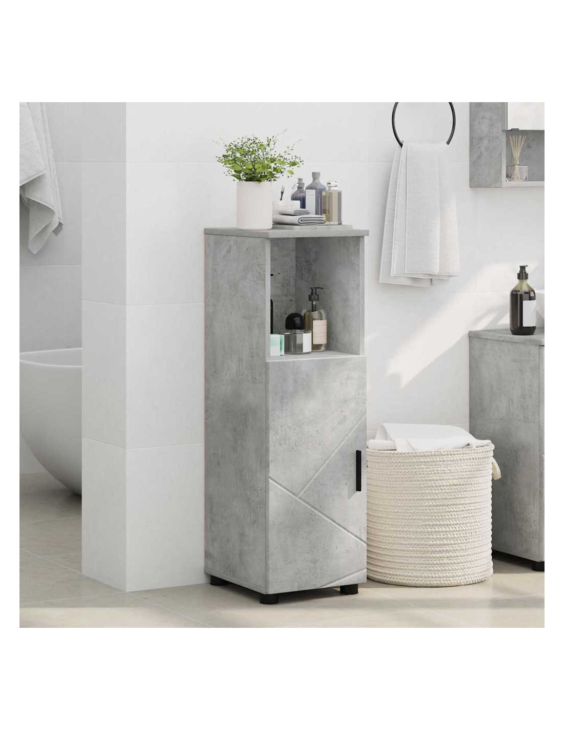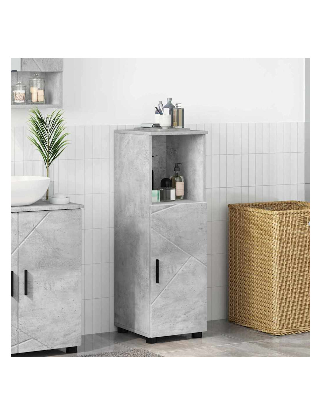 - Legno ingegnerizzato resistente: L'armadietto è fatto con legno ingegnerizzato, scelto per la sua resistenza e capacità di resistere all'umidità. Questo materiale assicura che l'armadietto mantenga il suo aspetto e funzionalità anche in ambienti umidi. La superficie liscia offre una piacevole sensazione al tatto, completando lo stile moderno.