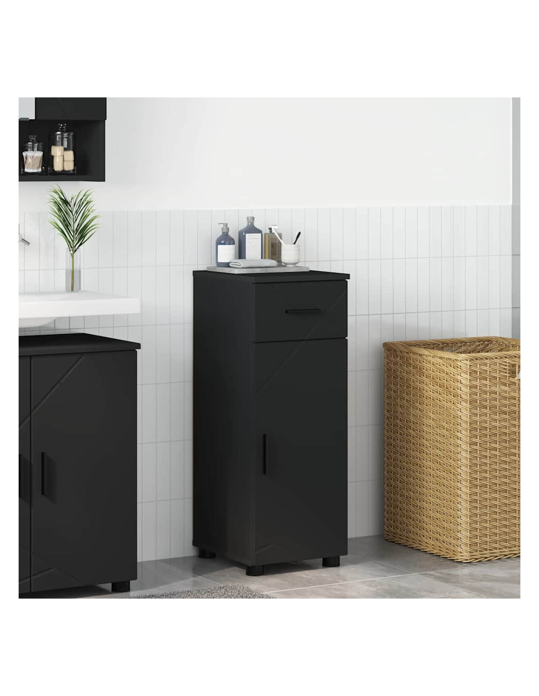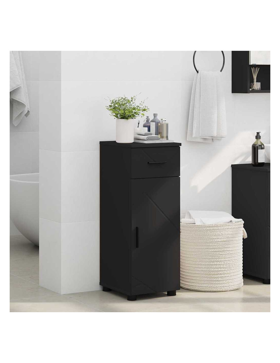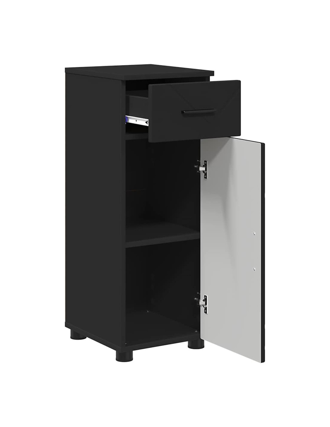 - Struttura in Legno Ingegnerizzato Questo armadietto è realizzato con legno ingegnerizzato di alta qualità, resistente all'usura e durevole. La finitura liscia mantiene l'atmosfera minimalista, offrendo una superficie robusta per l'uso quotidiano.