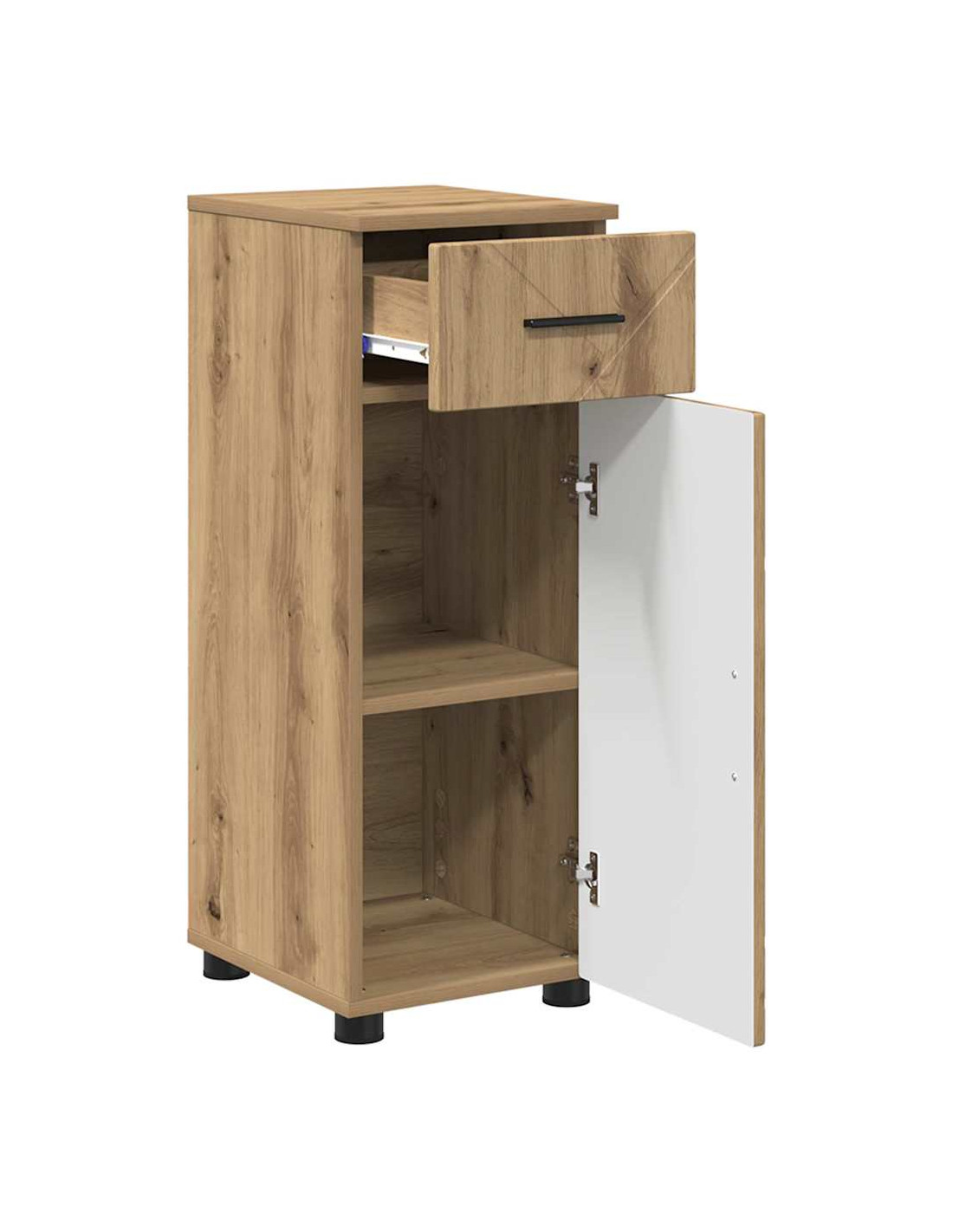 - Struttura in Legno Ingegnerizzato Questo armadietto è realizzato con legno ingegnerizzato di alta qualità, resistente all'usura e durevole. La finitura liscia mantiene l'atmosfera minimalista, offrendo una superficie robusta per l'uso quotidiano.