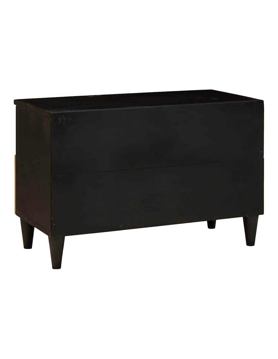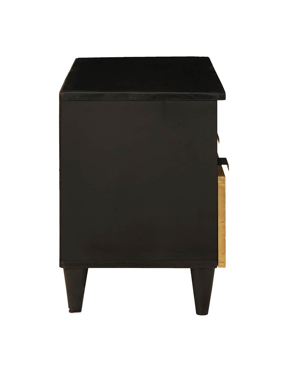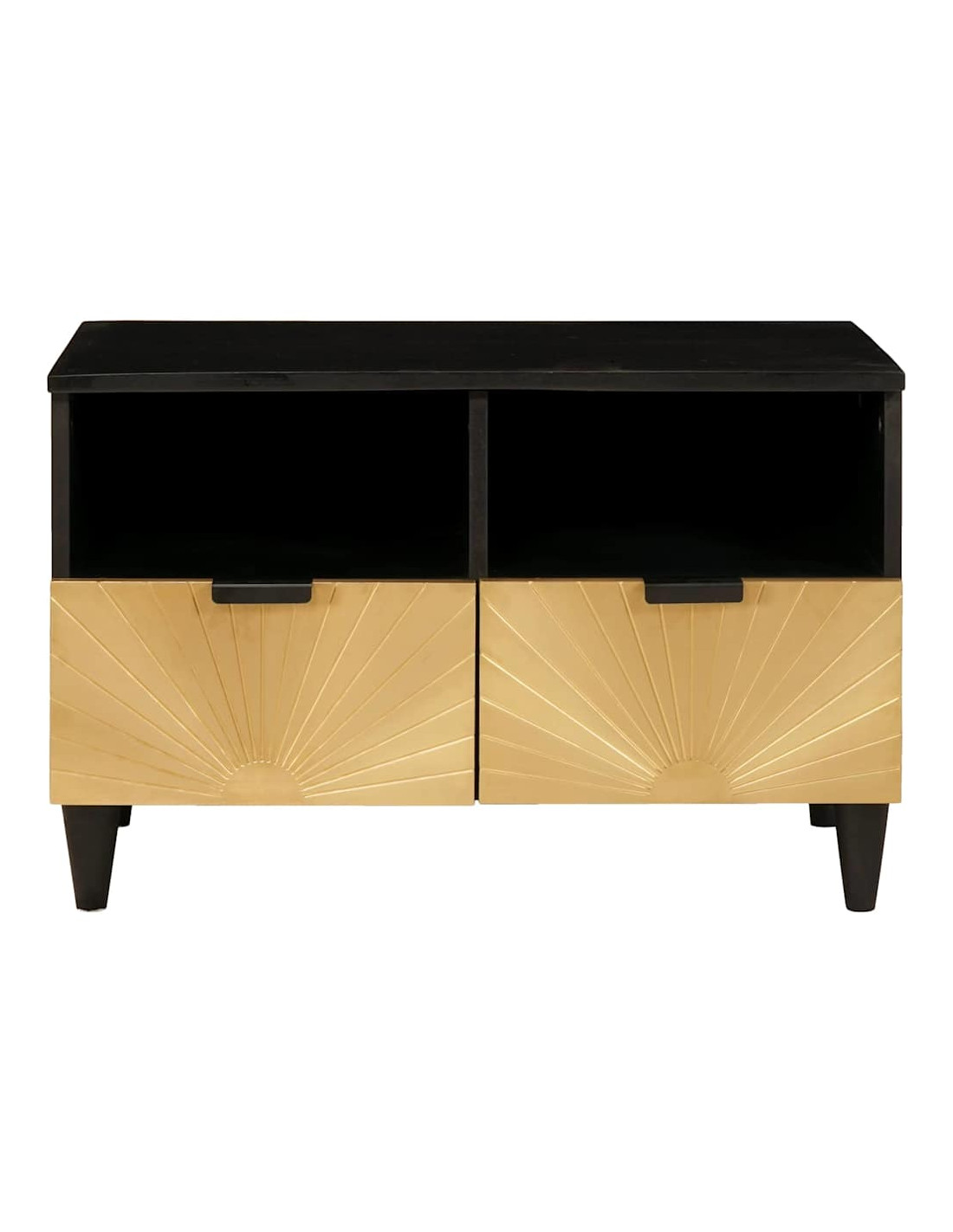 Dai un'occhiata a questo mobile TV in legno massello! È fatto con un mix fantastico di legno di mango e legno ingegnerizzato, che porta sia stile che praticità al tuo soggiorno. La sua forma rettangolare e la finitura lucida si adattano benissimo a qualsiasi arredamento moderno. La combinazione di nero e oro aggiunge un tocco chic, rendendolo super versatile per diversi stili.