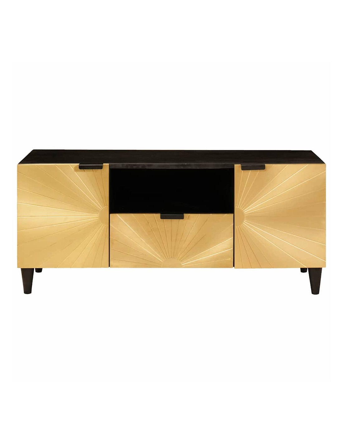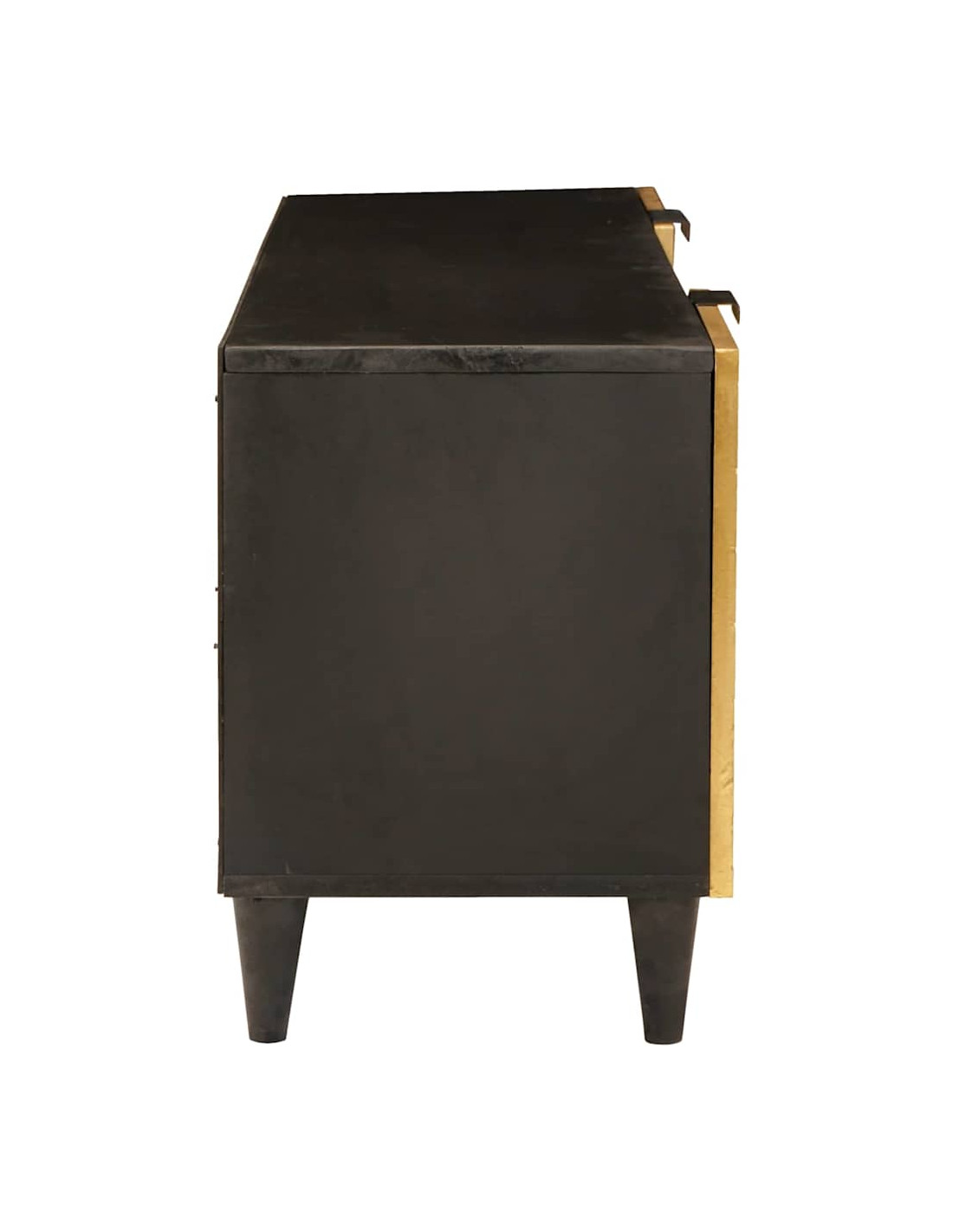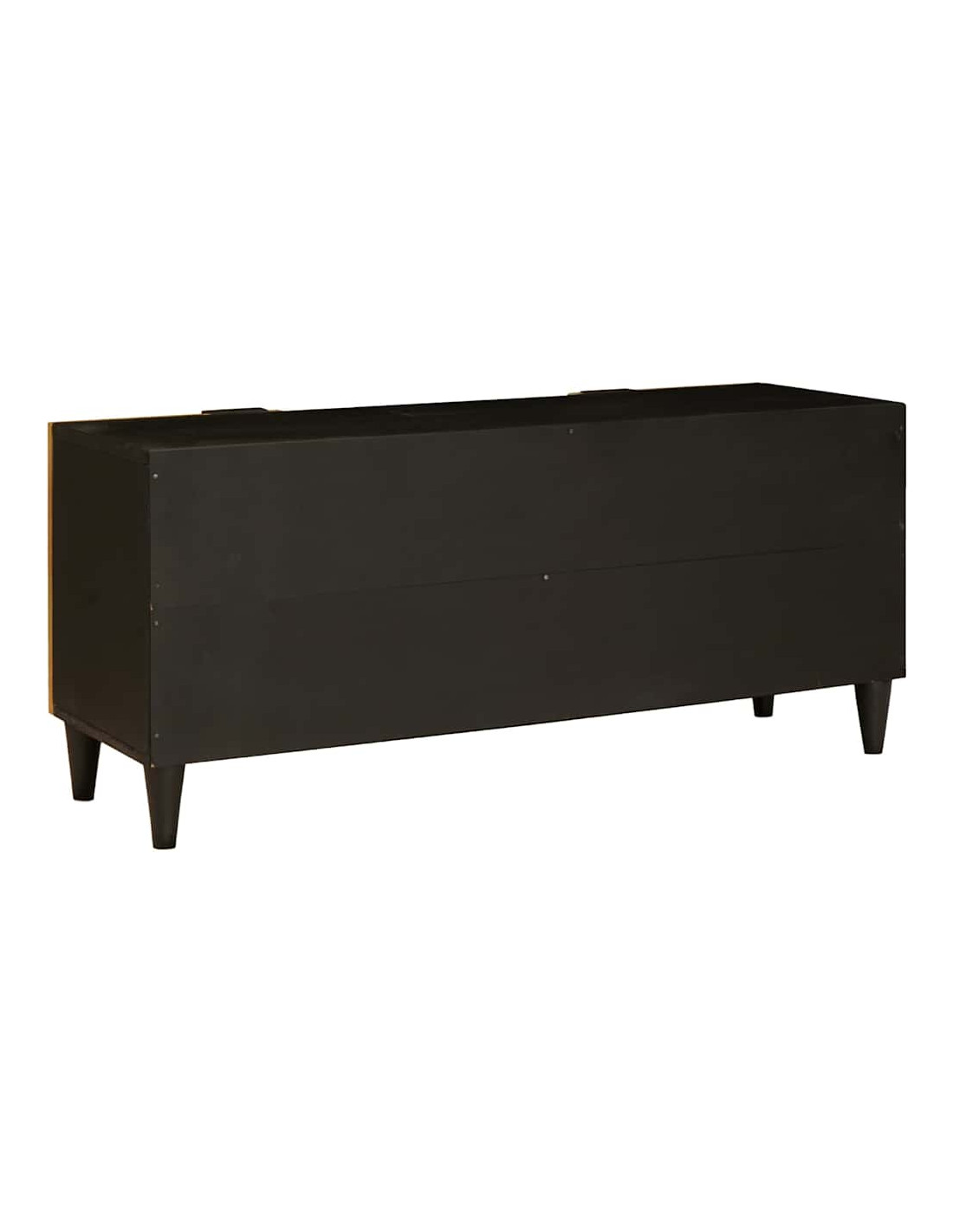 - Materiali di Alta Qualità: Questo mobile TV in legno massello di mango ha una finitura nera opaca che non passa inosservata. È resistente e trendy, combinando il legno ingegnerizzato con il legno di mango per un look classico e duraturo.