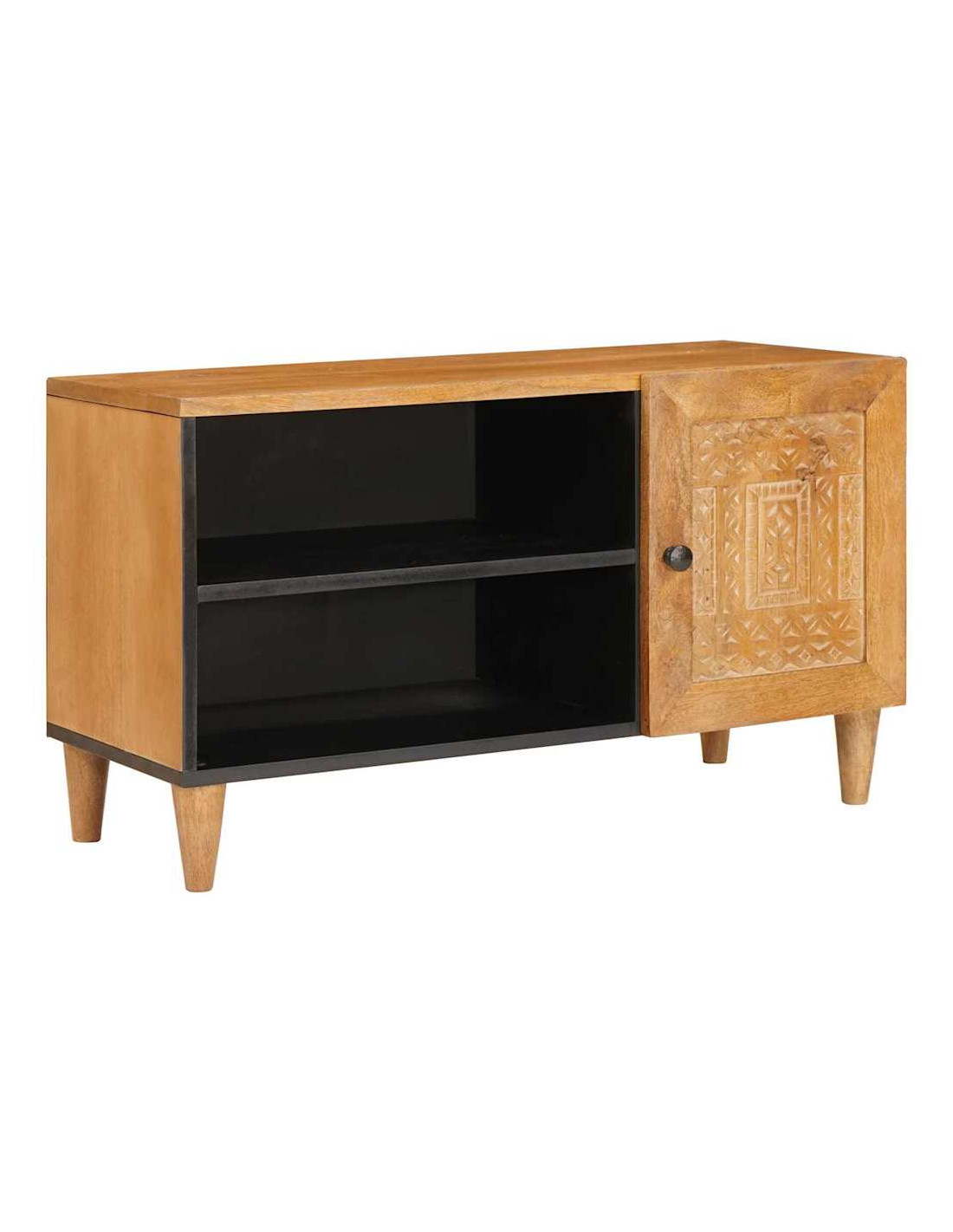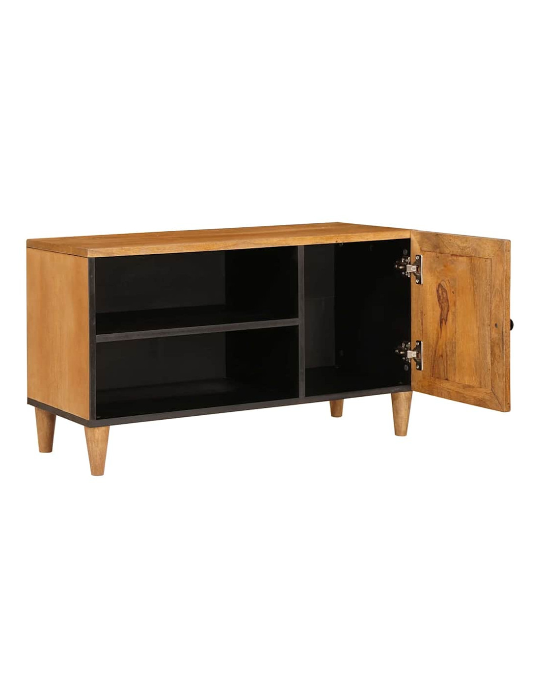 - Componenti Inclusi: Ha porte a cerniera, ripiani e pomelli con finitura opaca, tutti pensati per un uso facile, mantenendo quel look moderno. Le gambe affusolate, sempre in legno massello di mango, aggiungono carattere e stabilità, rendendolo una base solida per i tuoi dispositivi multimediali.