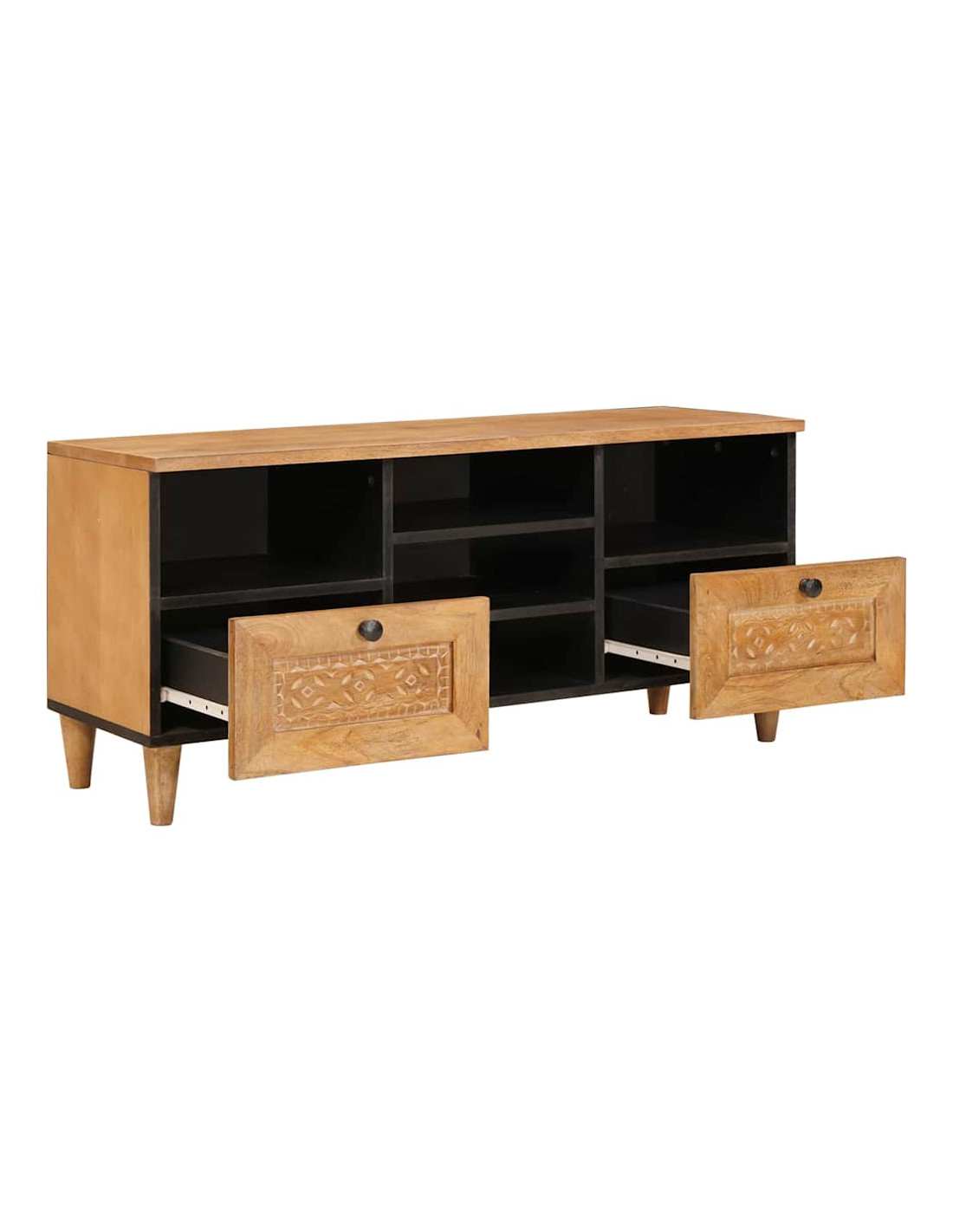 - Legno Massello di Mango: Questo mobile TV è realizzato in resistente legno massello di mango, garantendo una struttura durevole che resiste all'uso quotidiano mantenendo un aspetto piacevole. La bellissima venatura del legno di mango aggiunge un tocco naturale, mettendo in mostra una lavorazione di alta qualità. È una scelta intelligente per la durata, assicurando stile e affidabilità.