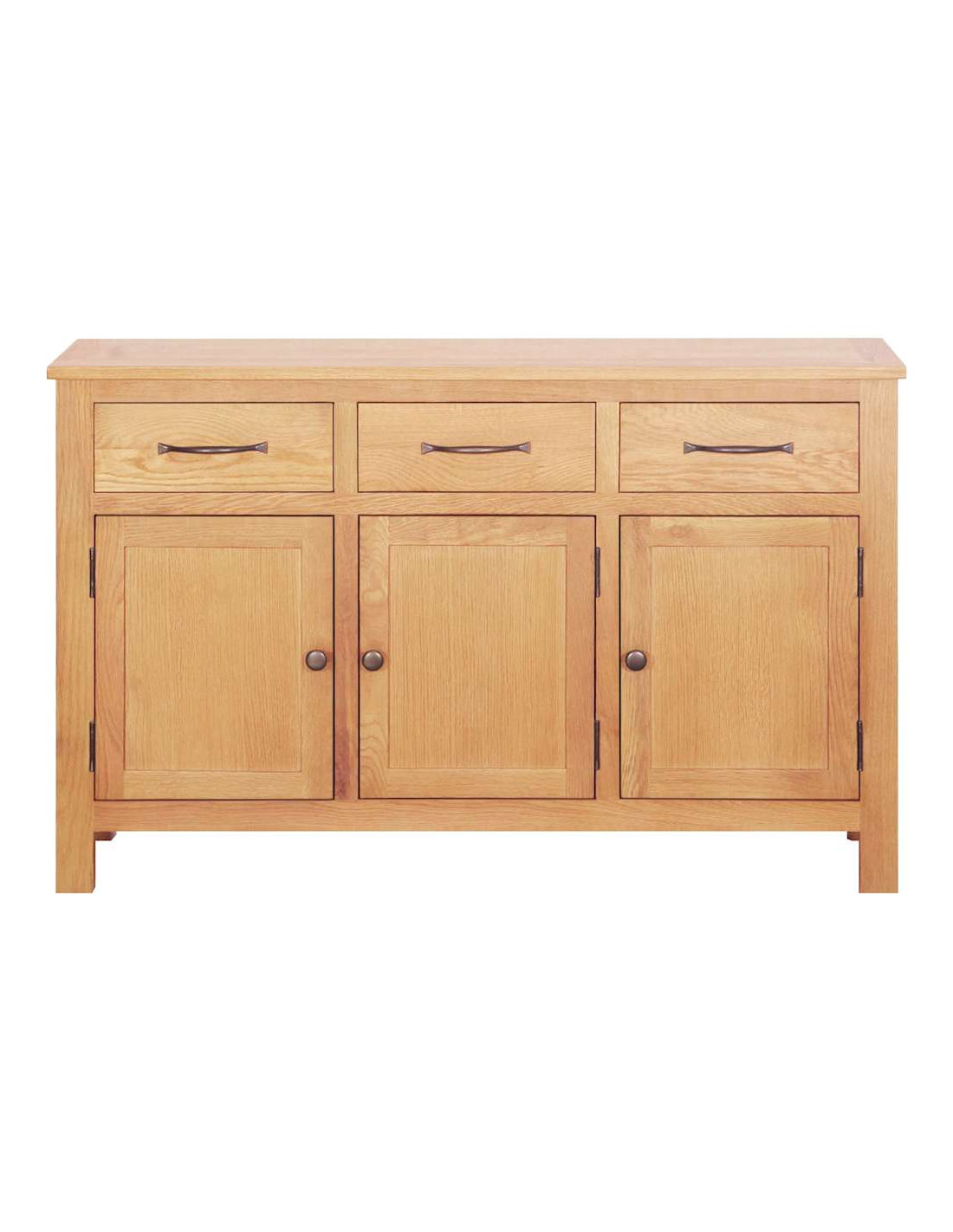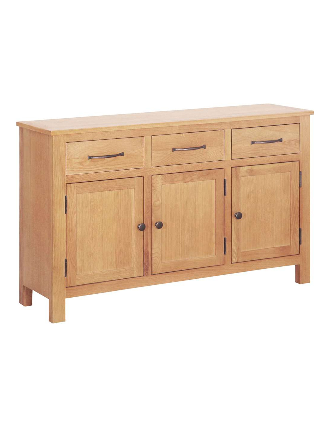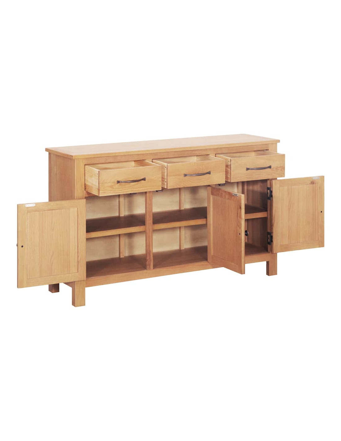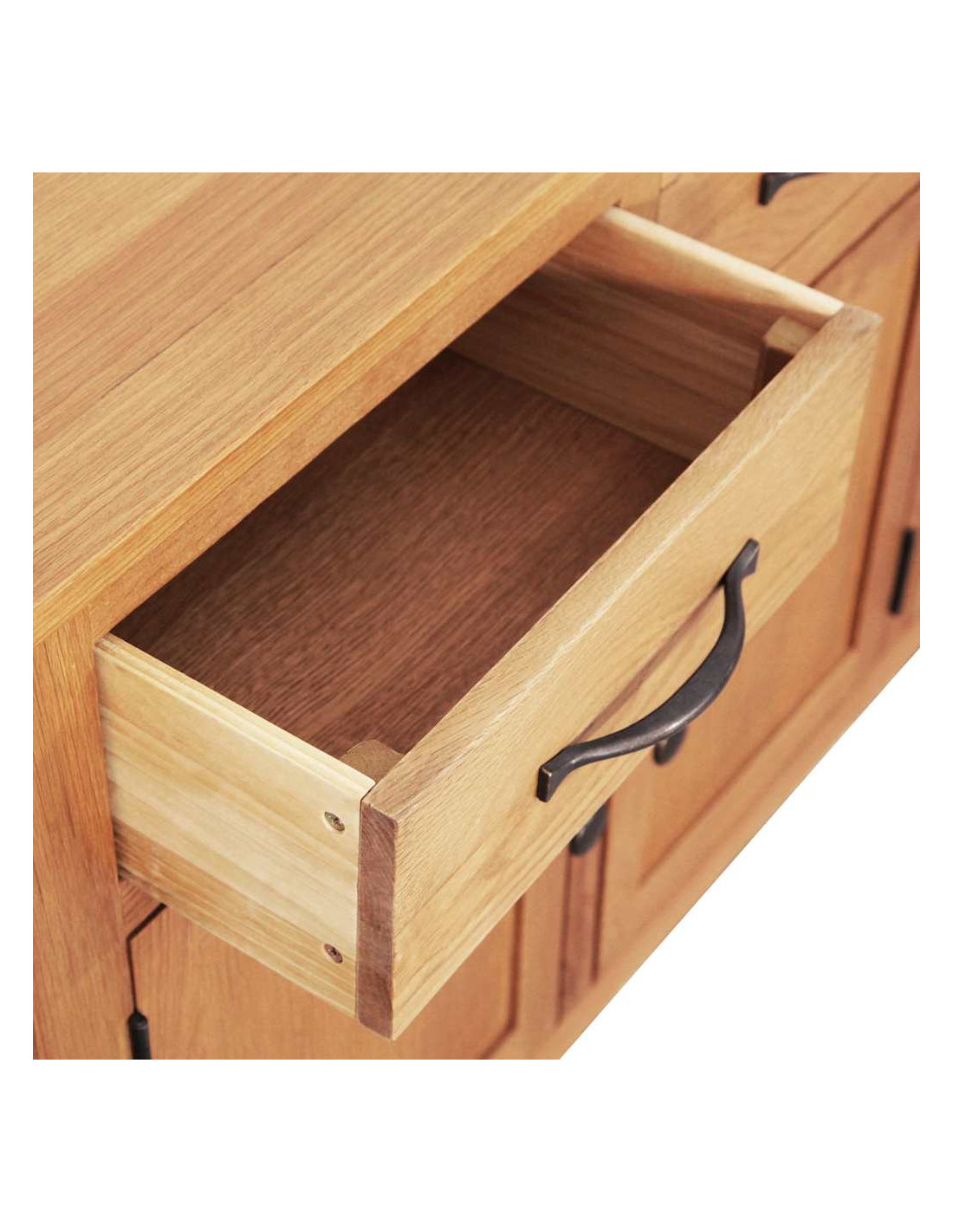 - Costruzione in rovere massello: Questo buffet è realizzato in legno di rovere massello di alta qualità, assicurando robustezza e una lunga durata. La sua solidità resiste all'usura quotidiana e aggiunge un fascino intramontabile al tuo arredamento.