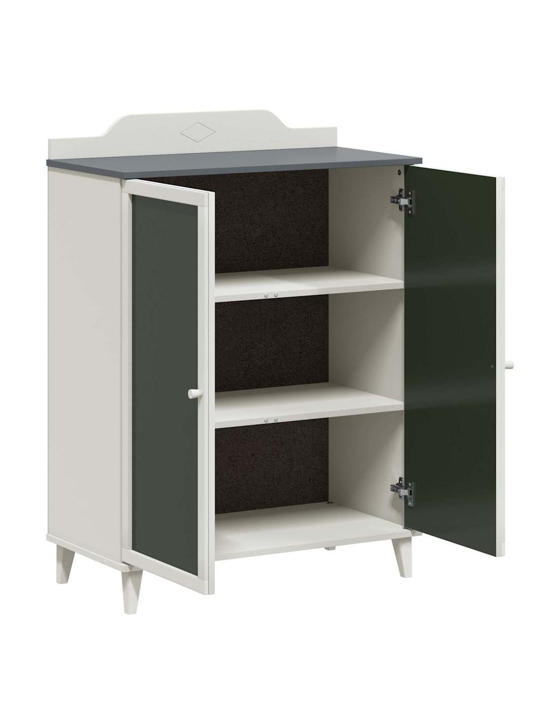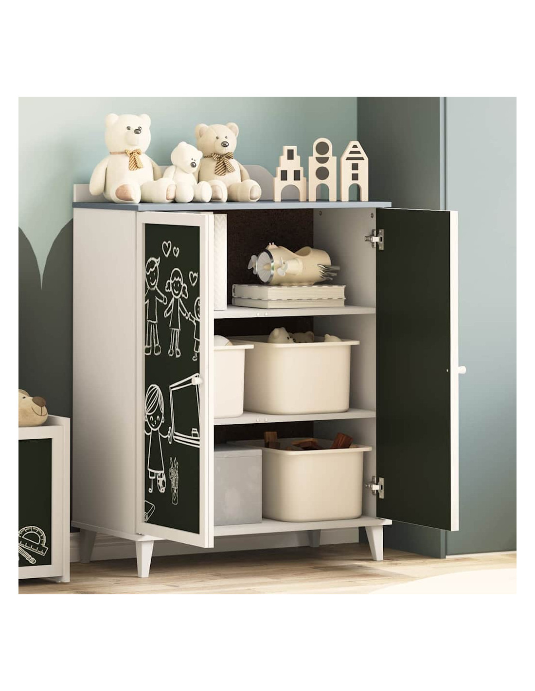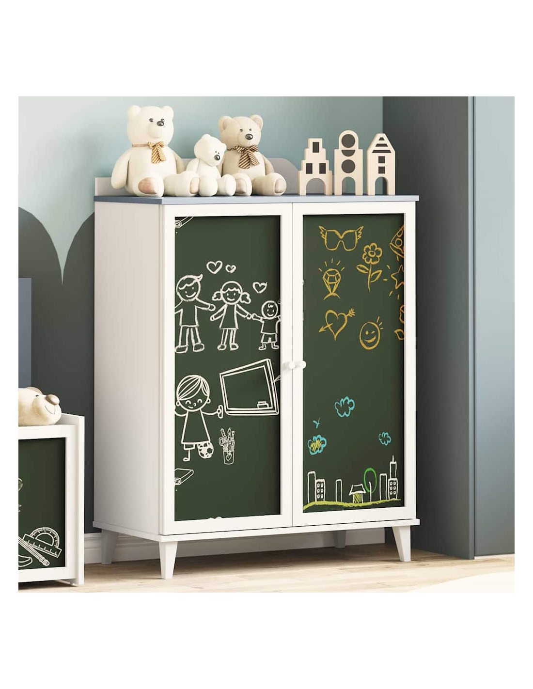 - Superficie in Lavagna Liscia: La superficie in lavagna dell'armadio è sia decorativa che pratica, permettendoti di personalizzarlo con messaggi o disegni. Questo particolare non solo rende gli spazi più interessanti, ma invita anche alla creatività.