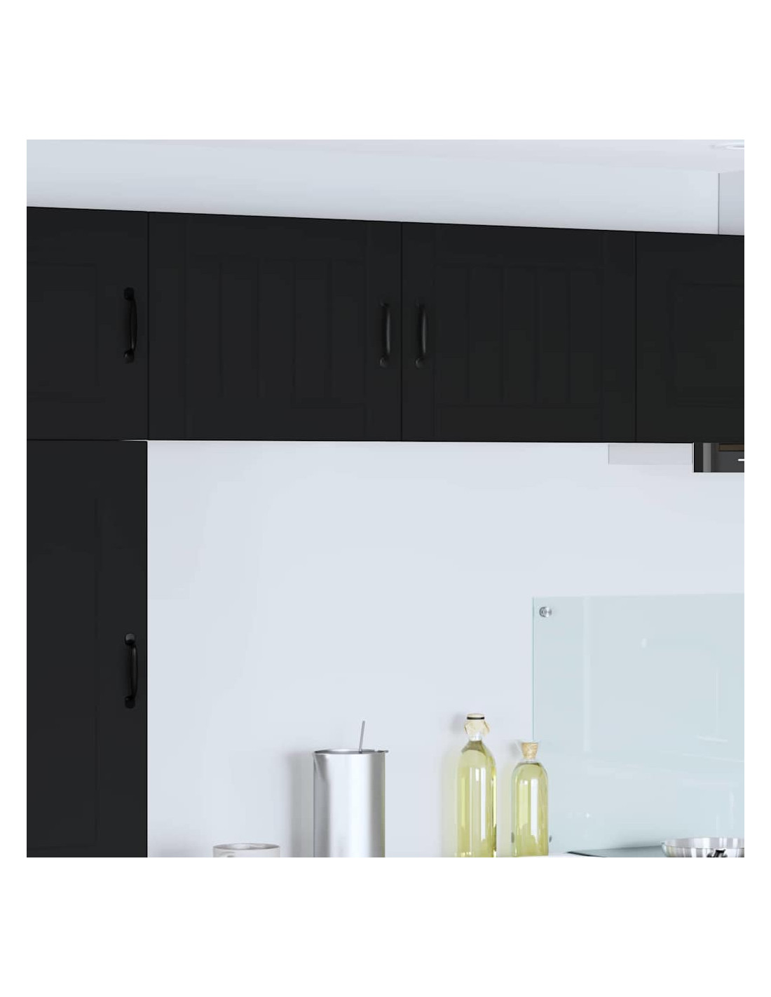 - Porte a cerniera:Le porte a cerniera rendono l'apertura fluida. Sono eleganti e si integrano perfettamente nelle cucine moderne. Le maniglie a barra nera offrono un bel contrasto e sono pratiche.