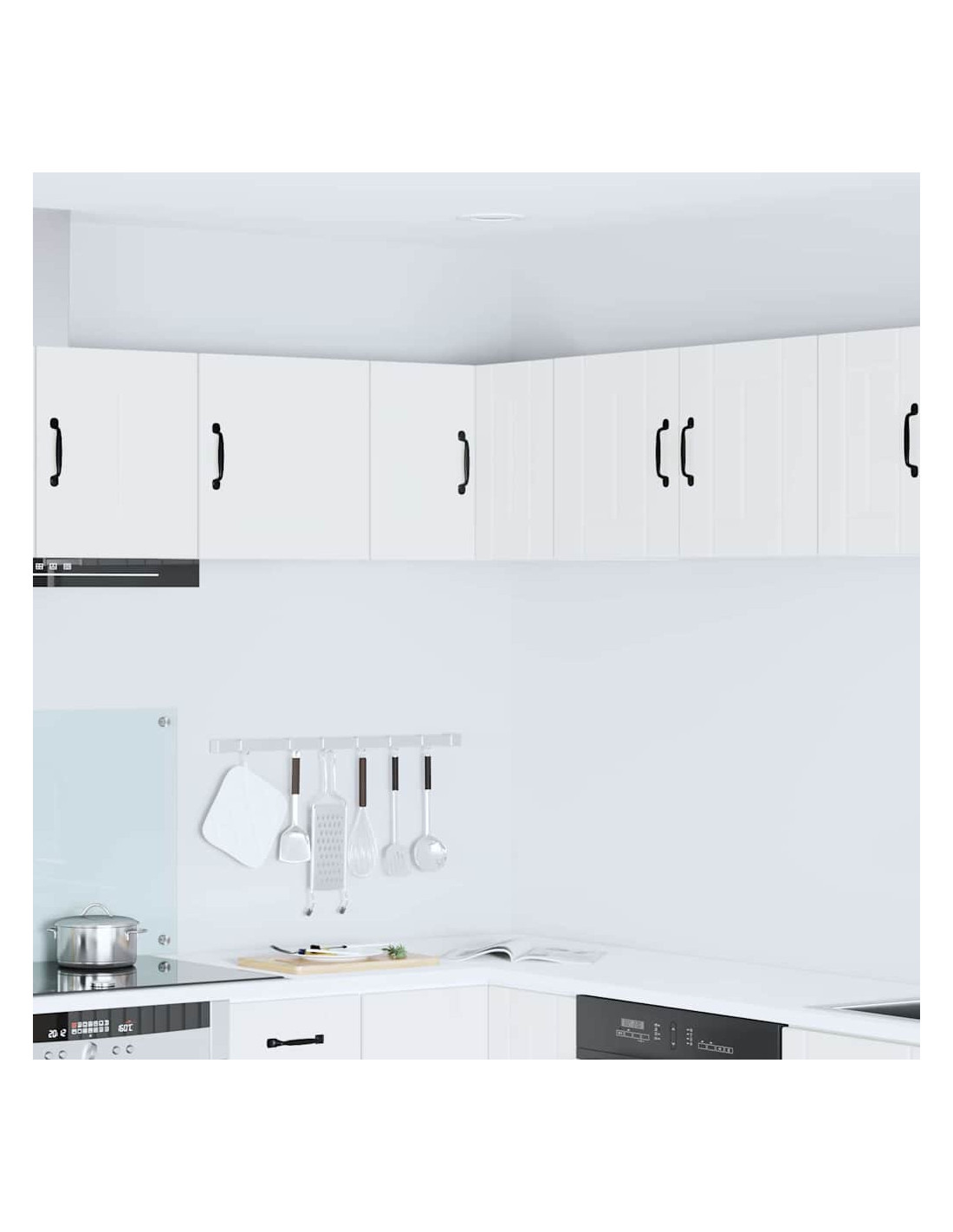 - Porte a cerniera:Le porte a cerniera rendono l'apertura fluida. Sono eleganti e si integrano perfettamente nelle cucine moderne. Le maniglie a barra nera offrono un bel contrasto e sono pratiche.