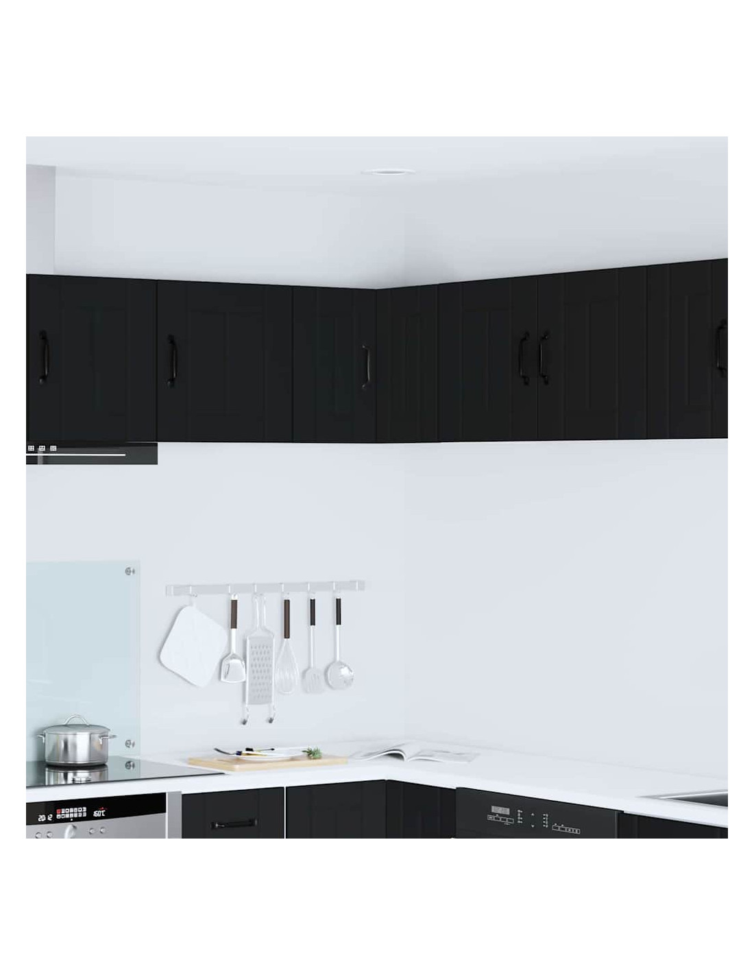 - Porte a cerniera:Le porte a cerniera rendono l'apertura fluida. Sono eleganti e si integrano perfettamente nelle cucine moderne. Le maniglie a barra nera offrono un bel contrasto e sono pratiche.